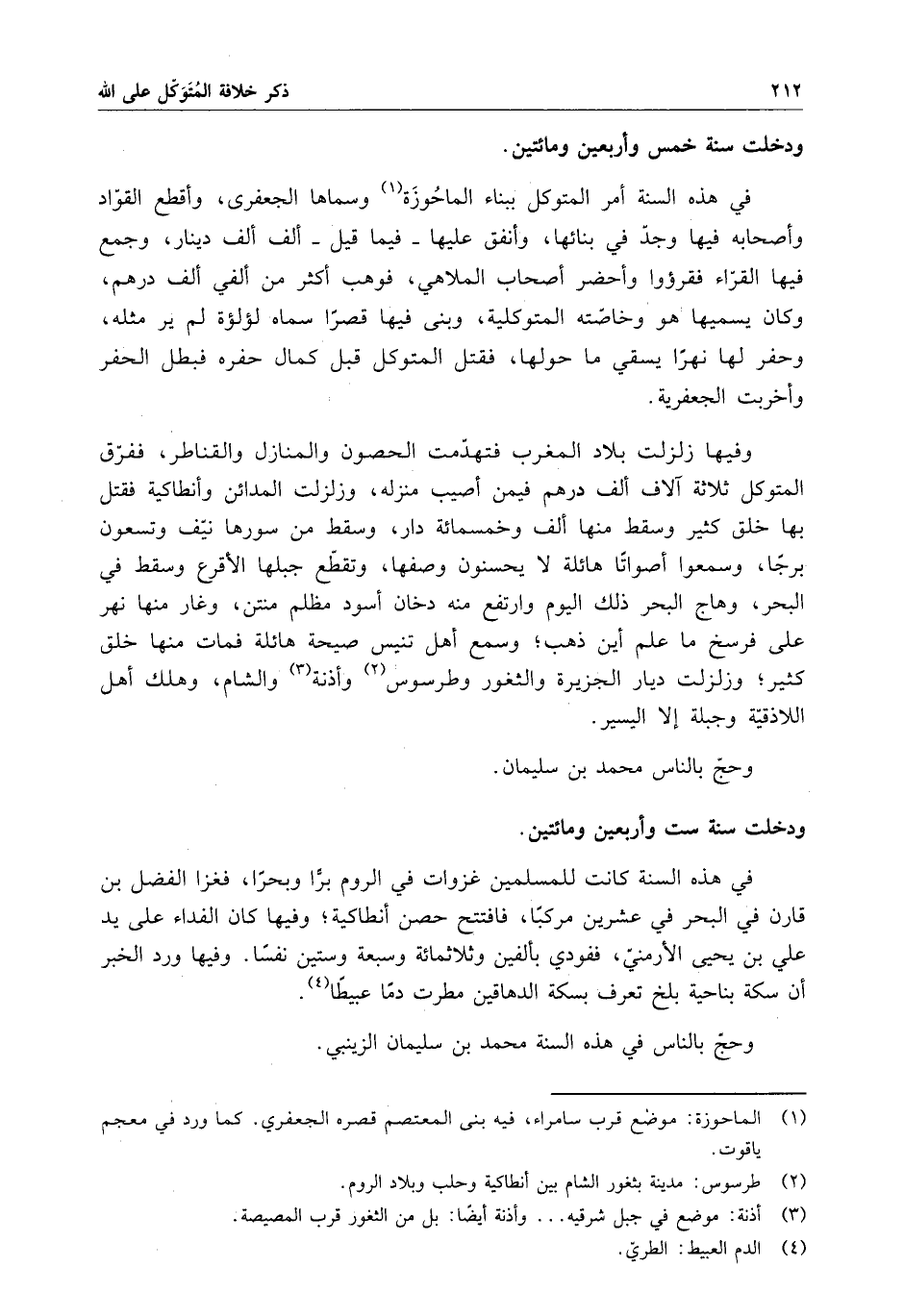 وفيها زلزت بلاد المغرب فتهدمت الحصون والمنازل والقناطر ، ففرق المتوكل ثلاثة آلاف ألف درهم فيمن أصيب منزله ، وزلزلت المدائن وأنطاكية فقتل بها خلق كثير وسقط منها ألف وخمسمائة دار ، وسقط من سورها نيف وتسعون برجاً ، وسمعوا أصواتاً هائلة لا يحسنون وصفها ، وتقطع جبلها الأقرع وسقط في البحر ، وهاج البحر ذلك اليوم وارتفع منه دخان أسود مظلم منتن ، وغار منها نهر على فرسخ ما علم أين ذهب ، وسمع أهل تنيس صيحة هائلة فمات منها خلق كثير ، وزلزلت ديار الجزيرة والثغور وطرسوس وأذنة والشام ، وهلك أهل اللاذقية وجبلة إلا اليسير .