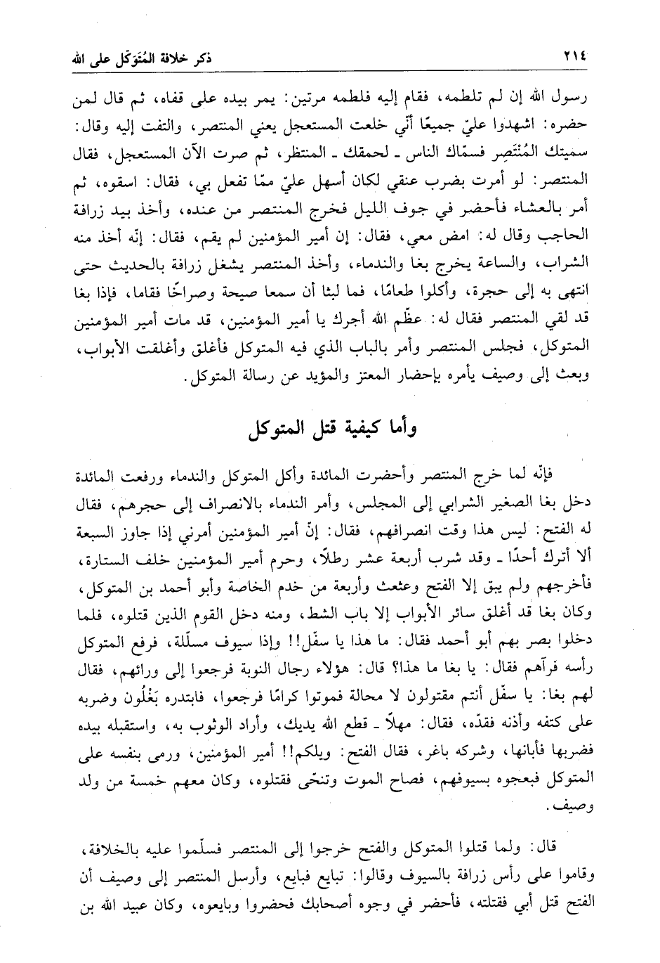 فإنه لما خرج المنتصر وأحضرت المائدة وأكل المتوكل والندماء ورفعت المائدة دخل بغا الصغير الشرابي إلى المجلس ، وأمر الندماء بالانصراف إلى حجرهم ، فقال له الفتح : ليس هذا وقت انصرافهم ، فقال : إن أمير المؤمنين أمرني إذا جاوز السبعة ألا أترك أحداً - وقد شرب أربعة عشر رطلاً ، وحرم أمير المؤمنين خلف الستارة ، فأخرجهم ولم يبق إلا الفتح وعثعث وأربعة من خدم الخاصة وأبو أحمد بن المتوكل ، وكان بغا قد أغلق سائر الأبواب إلا باب الشط ، ومنه دخل القوم الذين قتلوه ، فلما دخلوا بصر بهم أبو أحمد فقال : ما هذا يا سفل وإذا سيوف مسللة ، فرفع المتوكل رأسه فرآهم فقال : يا بغا ما هذا ؟ قال : هؤلاء رجال النوبة فرجعوا إلى ورائهم ، فقال لهم بغا : يا سفل أنتم مقتولون لا محالة فموتوا كراماً فرجعوا ، فابتدره بغلون وضربه على كتفه وأذنه فقده ، فقال : مهلاً - قطع الله يديك ، وأراد الوثوب به ، واستقبله بيده فضربها فأبانها ، وشركه باغر ، فقال الفتح : ويلكم أمير المؤمنين ، ورمى بنفسه على المتوكل فبعجوه بسيوفهم ، فصاح الموت وتنحى فقتلوه ، وكان معهم خمسة من ولد وصيف .