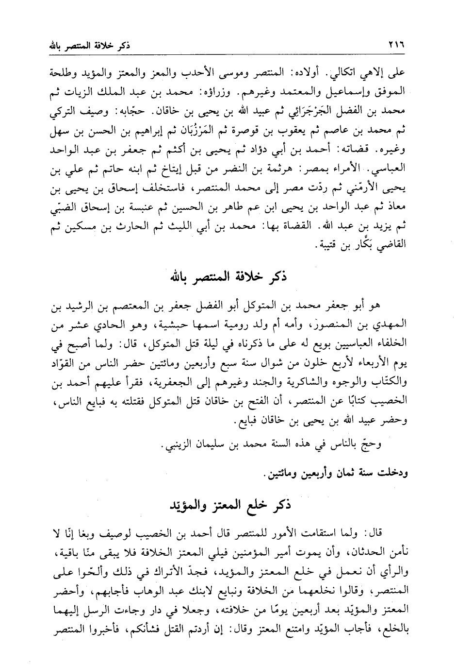 قال : ولما استقامت الأمور للمنتصر قال أحمد بن الخصيب لوصيف وبغا إنا لا نأمن الحدثان ، وأن يموت أمير المؤمنين فيلي المعتز الخلافة فلا يبقى منا باقية ، والرأي أن نعمل في خلع المعتز والمؤيد ، فجد الأتراك في ذلك وألحوا على المنتصر ، وقالوا نخلعهما من الخلافة ونبايع لابنك عبد الوهاب فأجابهم ، وأحضر المعتز والمؤيد بعد أربعين يوماً من خلافته ، وجعلا في دار وجاءت الرسل إليهما بالخلع ، فأجاب المؤيد وامتنع المعتز وقال : إن أردتم القتل فشأنكم ، فأخبروا المنتصر