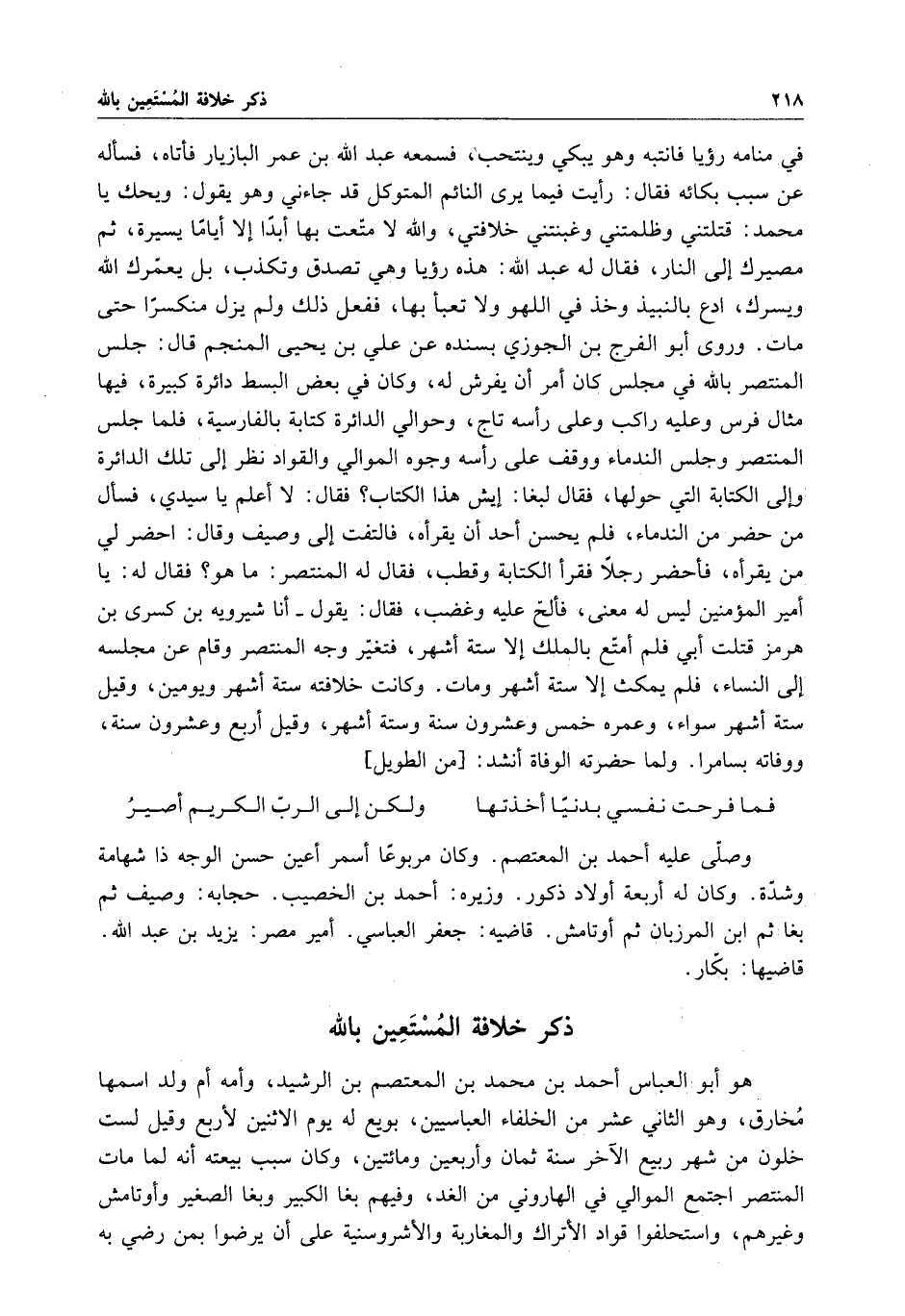 في منامه رؤيا فانتبه وهو يبكي وينتحب ، فسمعه عبد الله بن عمر البازيار فأتاه ، فسأله عن سبب بكائه فقال : رأيت فيما يرى النائم المتوكل قد جاءني وهو يقول : ويحك يا محمد : قتلتني وظلمتني وغبنتني خلافتي ، والله لا متعت بها أبداً إلا أياماً يسيرة ، ثم مصيرك إلى النار ، فقال له عبد الله : هذه رؤيا وهي تصدق وتكذب ، بل يعمرك الله ويسرك ، ادع بالنبيذ وخذ في اللهو ولا تعبأ بها ، ففعل ذلك ولم يزل منكسراً حتى مات . وروى أبو الفرج بن الجوزي بسنده عن علي بن يحيى المنجم قال : جلس المنتصر بالله في مجلس كان أمر أن يفرش له ، وكان في بعض البسط دائرة كبيرة ، فيها مثال فرس وعليه راكب وعلى رأسه تاج ، وحوالي الدائرة كتابة بالفارسية ، فلما جلس المنتصر وجلس الندماء ووقف على رأسه وجوه الموالي والقواد نظر إلى تلك الدائرة وإلى الكتابة التي حولها ، فقال لبغا : إيش هذا الكتاب ؟ فقال : لا أعلم يا سيدي ، فسأل من حضر من الندماء ، فلم يحسن أحد أن يقرأه ، فالتفت إلى وصيف وقال : أحضر لي من يقرأه ، فأحضر رجلاً فقرأ الكتابة وقطب ، فقال له المنتصر : ما هو ؟ فقال له : يا أمير المؤمنين ليس له معنى ، فألح عليه وغضب ، فقال : يقول - أنا شيرويه بن كسرى بن هرمز قتلت أبي فلم أمتع بالملك إلا ستة أشهر ، فتغير وجه المنتصر وقام عن مجلسه إلى النساء ، فلم يمكث إلا ستة أشهر ومات ، وكانت خلافته ستة أشهر ويومين ، وقيل ستة أشهر سواء ، وعمره خمس وعشرون سنة وستة أشهر ، وقيل أربع وعشرون سنة ، ووفاته بسامرا . ولما حضرته الوفاة أنشد :