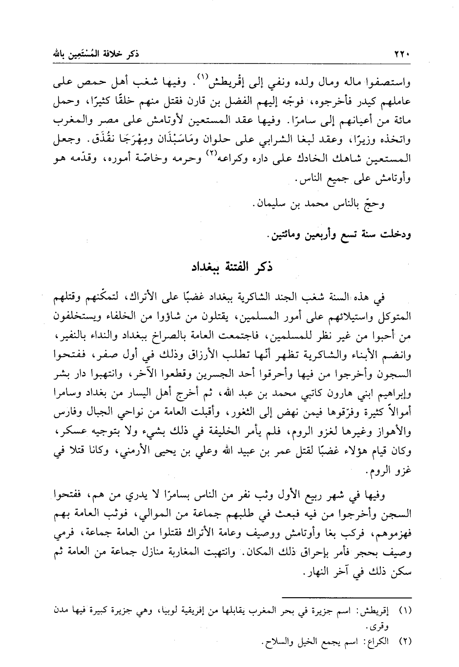 واستصفوا ماله ومال ولده ونفى إلى إقريطش . وفيها شغب أهل حمص على عاملهم كيدر فأخرجوه ، فوجه إليهم الفضل بن قارن فقتل منهم خلقاً كثيراً ، وحمل مائة من أعيانهم إلى سامرا . وفيها عقد المستعين لأوتامش على مصر والمغرب واتخذه وزيراً ، وعقد لبغا الشرابي على حلوان وماسبذان ومهرجا نقذق . وجعل المستعين شاهك الخادم على داره وكراعه وحرمه وخاصة أموره . وقدمه هو وأوتامش على جميع الناس .