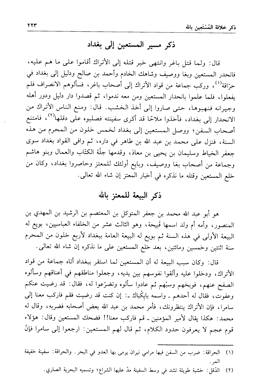 قال : ولما قتل باغر وانتهى خبر قتله إلى الأتراك أقاموا على ما هم عليه ، فانحدر المستعين وبغا ووصيف وشاهك الخادم وأحمد بن صالح ودليل إلى بغداد في حراقة ، وركب جماعة من قواد الأتراك إلى أصحاب باغر ، فسألوهم الانصراف فلم يفعلوا ، فلما علموا بانحدار المستعين ومن معه ندموا ، ثم قصدوا دار الدليل ودور أهله وجيرانه فنهبوها ، حتى صاروا إلى أخذ الخشب . قال : ومنع الناس الأتراك من الانحدار إلى بغداد ، فأخذوا ملاحاً قد أكرى سفينته فصلبوه على دقلها ، فامتنع أصحاب السفن ، ووصل المستعين إلى بغداد لخمس خلون من المحرم من هذه السنة ، فنزل على محمد بن عبد الله بن طاهر في داره ، ثم وافى القواد بغداد سوى جعفر الخياط وسليمان بن يحيى بن معاذ ، وقدمها جلة الكتاب والعمال وبنو هاشم وجماعة من أصحاب بغا ووصيف ، وبايع أولئك للمعتز وحاصروا بغداد ، وكان من خلع المستعين وقتله ما نذكره في أخبار المعتز إن شاء الله تعالى .