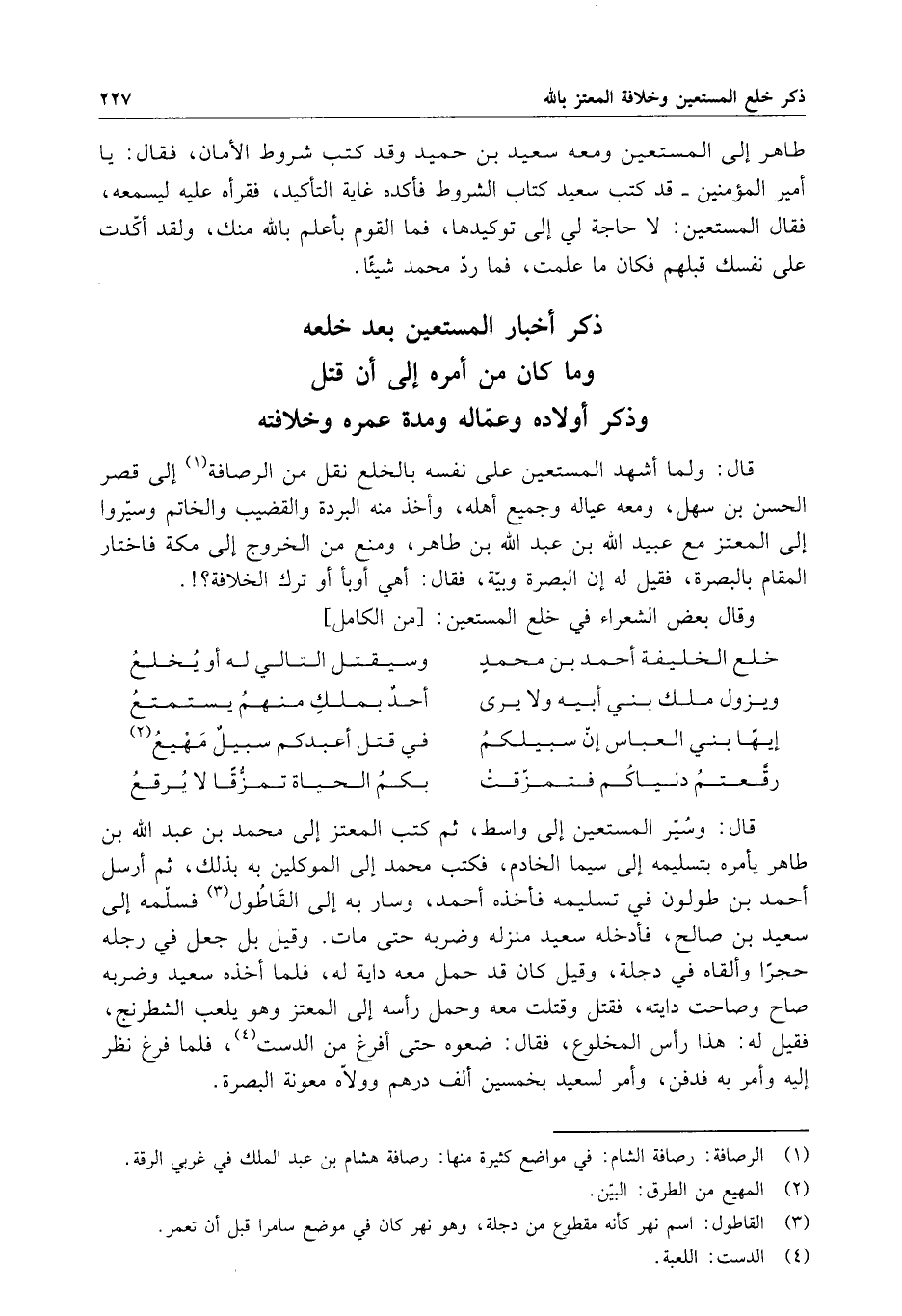 طاهر إلى المستعين ومعه سعيد بن حميد وقد كتب شروط الأمان ، فقال : يا أمير المؤمنين - قد كتب سعيد كتاب الشروط فأكده غاية التأكيد ، فقرأه عليه ليسمعه ، فقال المستعين : لا حاجة لي إلى توكيدها ، فما القوم بأعلم بالله منك ، ولقد أكدت على نفسك قبلهم فكان ما علمت ، فما رد محمد شيئاً .