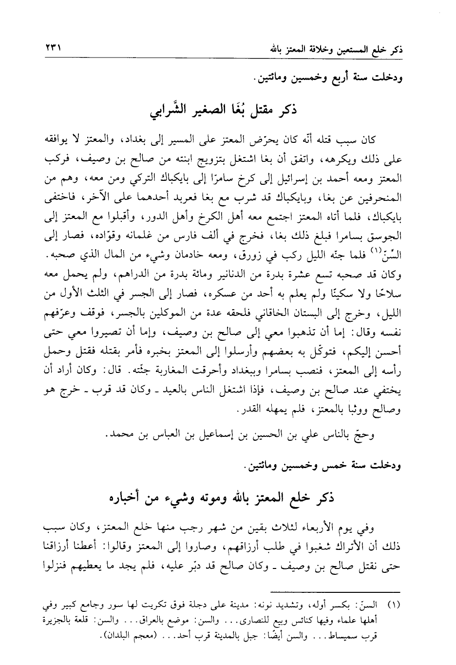 وفي يوم الأربعاء لثلاث بقين من شهر رجب منها خلع المعتز ، وكان سبب ذلك أن الأتراك شغبوا في طلب أرزاقهم ، وصاروا إلى المعتز وقالوا : أعطنا أرزاقنا حتى نقتل صالح بن وصيف - وكان صالح قد دبر عليه ، فلم يجد ما يعطيهم فنزلوا