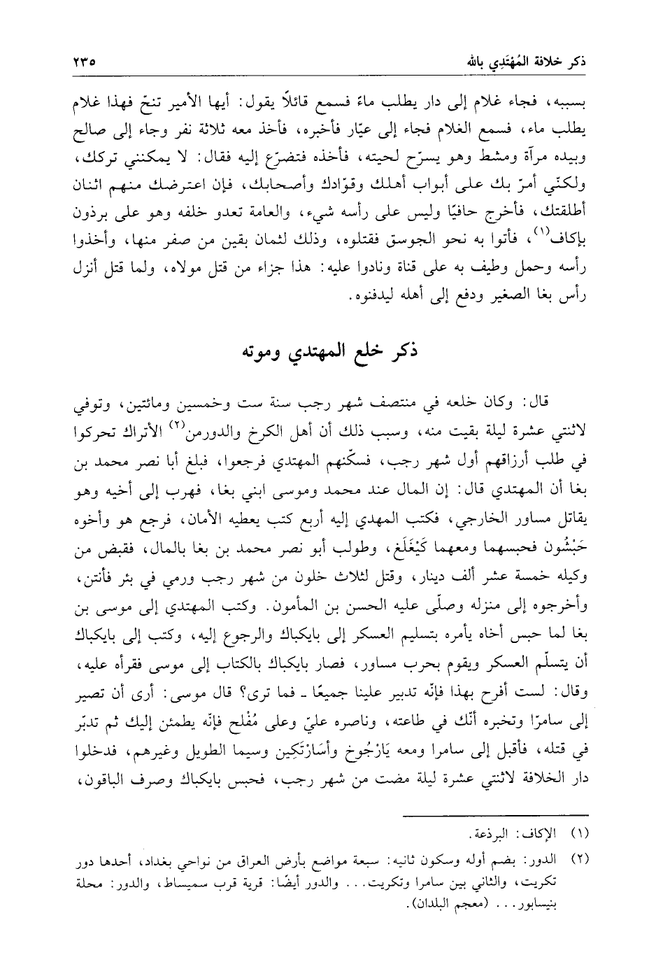 قال : وكان خلعه في منتصف شهر رجب سنة ست وخمسين ومائتين ، وتوفي لاثنتي عشرة ليلة بقيت منه ، وسبب ذلك أن أهل الكرخ والدورمن الأتراك تحركوا في طلب أرزاقهم أول شهر رجب ، فسكنهم المهتدي فرجعوا ، فبلغ أبا نصر محمد بن بغا أن المهتدي قال : إن المال عند محمد وموسى ابني بغا ، فهرب إلى أخيه وهو يقاتل مساور الخارجي ، فكتب المهدي إليه أربع كتب يعطيه الأمان ، فرجع هو وأخوه حبشون فحبسهما ومعهما كيغلغ ، وطولب أبو نصر محمد بن بغا بالمال ، فقبض من وكيله خمسة عشر ألف دينار ، وقتل لثلاث خلون من شهر رجب ورمي في بئر فأنتن ، وأخرجوه إلى منزله وصلى عليه الحسن بن المأمون ، وكتب المهتدي إلى موسى بن بغا لما حبس أخاه يأمره بتسليم العسكر إلى بايكباك والرجوع إليه ، وكتب إلى بايكباك أن يتسلم العسكر ويقوم بحرب مساور ، فصار بايكباك بالكتاب إلى موسى فقرأه عليه ، وقال : لست أفرح بهذا فإنه تدبير علينا جميعاً - فما ترى ؟ قال موسى : أرى أن تصير إلى سامرا وتخبره أنك في طاعته ، وناصره علي وعلى مفلح فإنه يطمئن إليك ثم تدبر في قتله ، فأقبل إلى سامرا ومعه يارجوخ وأسارتكين وسيما الطويل وغيرهم ، فدخلوا دار الخلافة لاثنتي عشرة ليلة مضت من شهر رجب ، فحبس بايكباك وصرف الباقون ،
