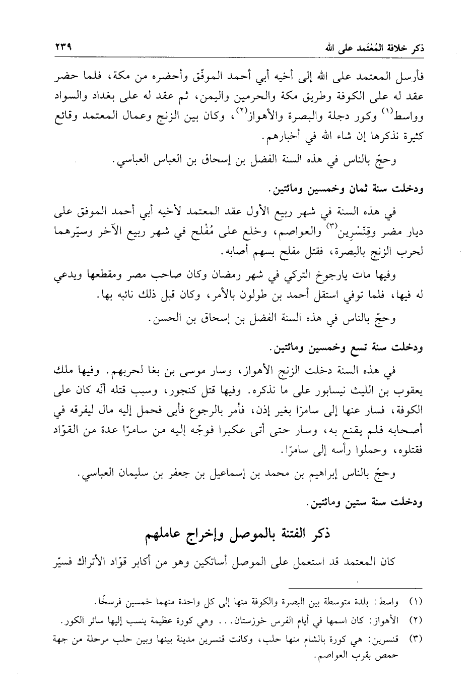 فأرسل المعتمد على الله إلى أخيه أبي أحمد الموفق وأحضره من مكة ، فلما حضر عقد له على الكوفة وطريق مكة والحرمين واليمن ، ثم عقد له على بغداد والسواد وواسط وكور دجلة والبصرة والأهواز ، وكان بين الزنج وعمال المعتمد وقائع كثيرة نذكرها إن شاء الله في أخبارهم .