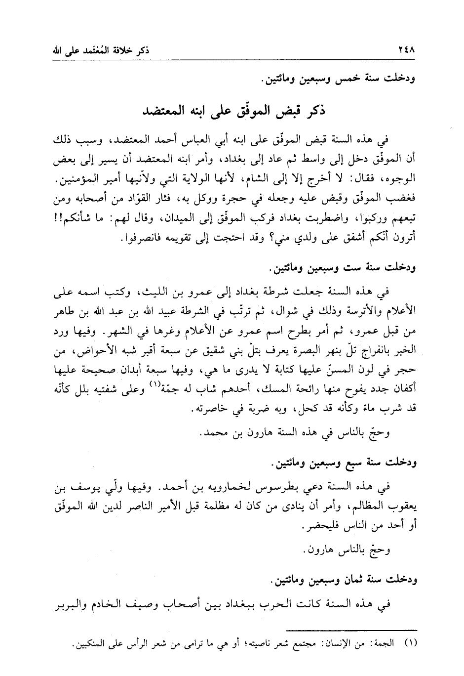 في هذه السنة قبض الموفق على ابنه أبي العباس أحمد المعتضد ، وسبب ذلك أن الموفق دخل إلى واسط ثم عاد إلى بغداد ، وأمر ابنه المعتصد أن يسير إلى بعض الوجوه ، فقال : لا أخرج إلا إلى الشام ، لأنها الولاية التي ولانيها أمير المؤمنين . فغضب الموفق وقبض عليه وجعله في حجرة ووكل به ، فثار القواد من أصحابه ومن تبعهم وركبوا ، واضطربت بغداد فركب الموفق إلى الميدان ، وقال لهم : ما شأنكم أترون أنكم أشفق على ولدي مني ؟ وقد احتجت إلى تقويمه فانصرفوا .
