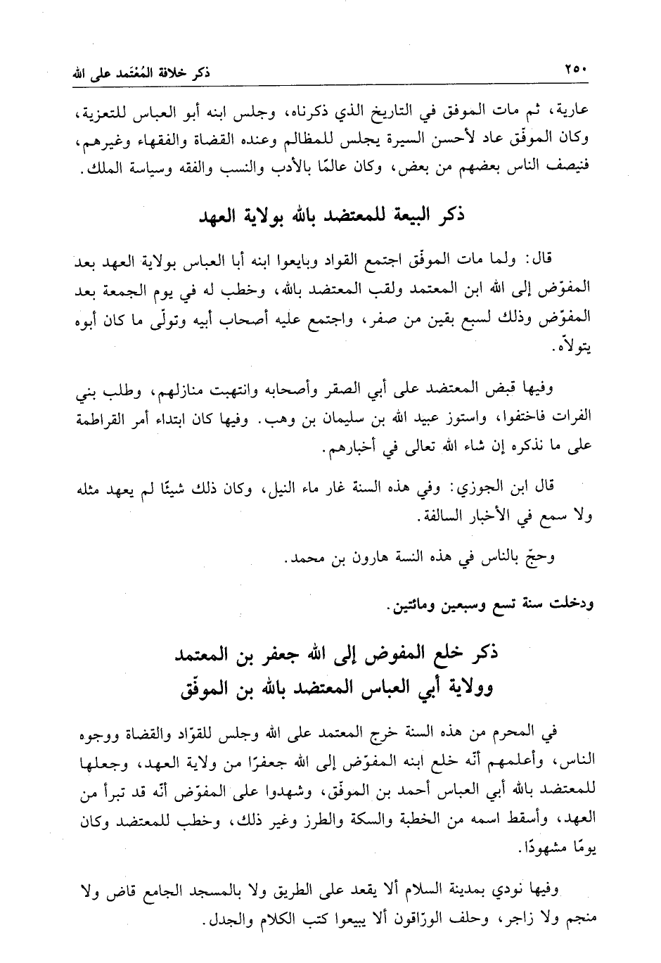 عارية ، ثم مات الموفق في التاريخ الذي ذكرناه ، وجلس ابنه أبو العباس للتعزية ، وكان الموفق عاد لأحسن السيرة يجلس للمظالم وعنده القضاة والفقهاء وغيرهم ، فينصف الناس بعضهم من بعض ، وكان عالماً بالأدب والنسب والفقه وسياسة الملك .