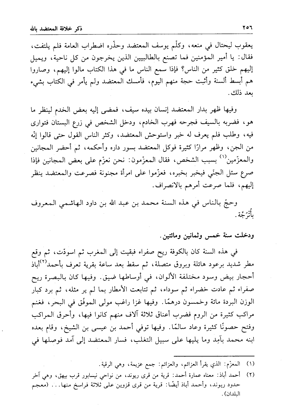 في هذه السنة كان بالكوفة ريح صفراء فبقيت إلى المغرب ثم اسودت ، ثم وقع مطر شديد برعود هائلة وبروق متصلة ، ثم سقط بعد ساعة بقرية تعرف بأحمد أباذ أحجار بيض وسود مختلفة الألوان ، في أوساطها ضيق . وفيها كان بالبصرة ريح صفراء ثم عادت خضراء ثم سوداء ، ثم تتابعت الأمطار بما لم ير مثله ، ثم برد كبار الوزن البردة مائة وخمسون درهماً . وفيها غزا راغب مولى الموفق في البحر ، فغنم مراكب كثيرة من الروم فضرب أعناق ثلاثة آلاف منهم كانوا فيها ، وأحرق المراكب وفتح حصوناً كثيرة وعاد سالماً . وفيها توفي أحمد بن عيسى بن الشيخ ، وقام بعده ابنه محمد بآمد وما يليها على سبيل التغلب ، فسار المعتضد إلى آمد فوصلها في