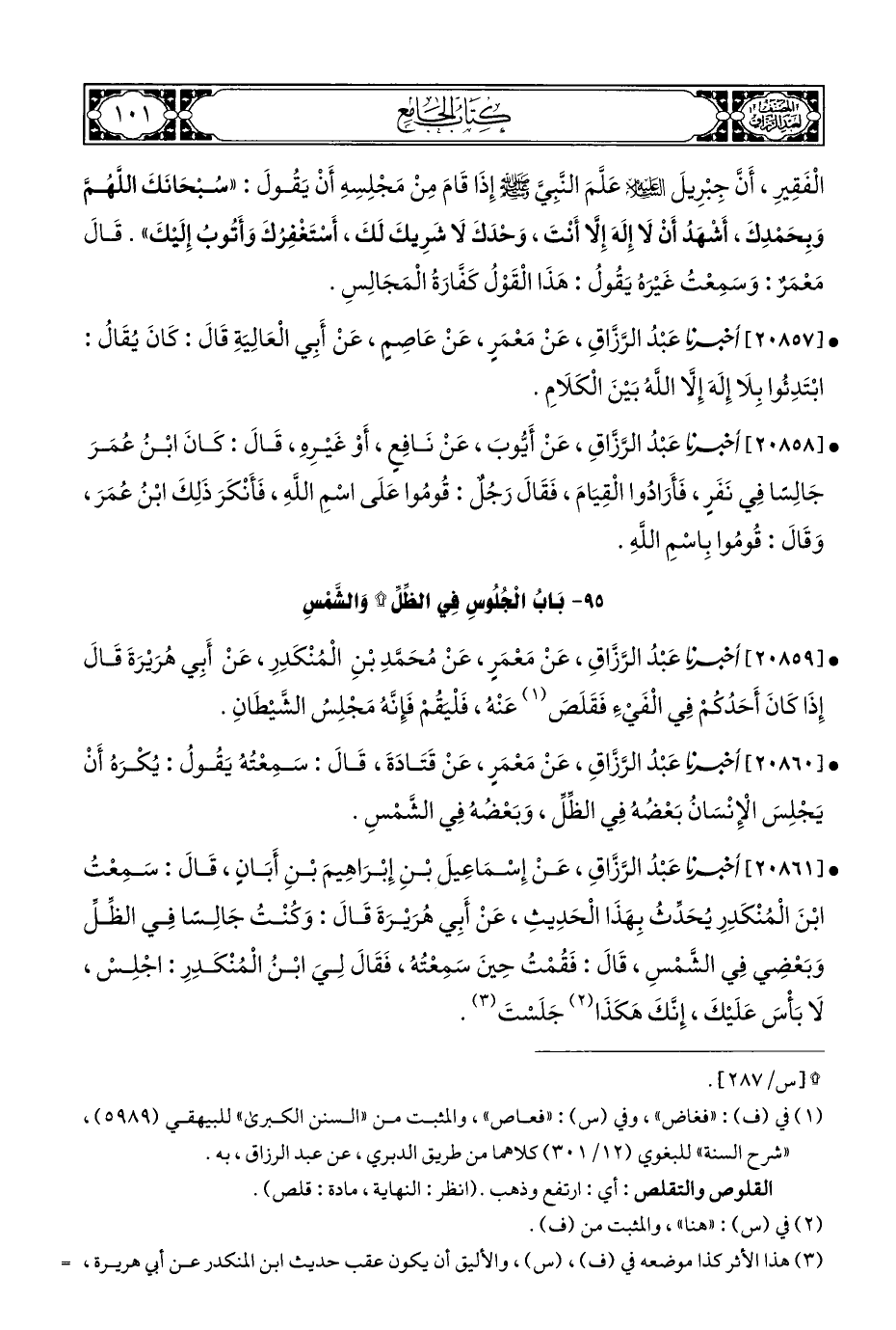 • [٢٠٨٦١] أخبرنا عَبْدُ الرَّزَّاقِ، عَنْ إِسْمَاعِيلَ بْنِ إِبْرَاهِيمَ بْنِ أَبَانٍ، قَالَ: سَمِعْتُ ابْنَ الْمُنْكَدِرِ يُحَدِّثُ بِهَذَا الْحَدِيثِ، عَنْ أَبِي هُرَيْرَةَ قَالَ: وَكُنْتُ جَالِسًا فِي الظِّلِّ وَبَعْضِي فِي الشَّمْسِ، قَالَ: فَقُمْتُ حِينَ سَمِعْتُه، فَقَالَ لِيَ ابْنُ الْمُنْكَدِرِ: اجْلِسْ، لَا بَأْسَ عَلَيْكَ، إِنَّكَ هَكَذَا (¬٢) جَلَسْتَ (¬٣).