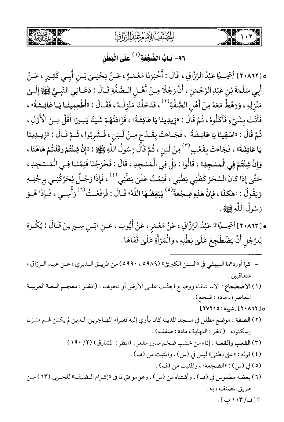 ° [٢٠٨٦٢] أخبرنا عَبْدُ الرَّزَّاقِ، قَالَ: أَخْبَرَنَا مَعْمَرٌ، عَنْ يَحْيَى بْنِ أَبِي كَثِيرٍ، عَنْ أَبِي سَلَمَةَ بْنِ عَبْدِ الرَّحْمَنِ، أَنَّ رَجُلًا مِنْ أَهْلِ الصُّفَّةِ قَالَ: دَعَانِي النَّبِيُّ - صلى الله عليه وسلم - إِلَى مَنْزِلِهِ، وَرَهْطٌ مَعَهُ مِنْ أَهْلِ الصُّفَّةِ (¬٢)، فَدَخَلْنَا مَنْزِلَه، فَقَالَ: "أَطْعِمِينَا يَا عَائِشَةُ"، فَأَتَتْ بِشَيءٍ فَأَكَلُوه، ثُمَّ قَالَ: "زِيدِينَا يَا عَائِشَةُ"، فَزَادَتْهُمْ شَيْئًا يَسِيرًا أَقَلَّ مِنَ الْأَوَّلِ، ثُمَّ قَالَ: "اسْقِينَا يَا عَائِشَةُ"، فَجَاءَتْ بِقَدَحٍ مِنْ لَبَنٍ، فَشَرِبُوا، ثُمَّ قَالَ: "زِيدِينَا يَا عَائِشَةُ"، فَجَاءَتْ بِقَعْبٍ (¬٣) مِنْ لَبَنٍ، ثُمَّ قَالَ رَسُولُ اللَّهِ - صلى الله عليه وسلم -: "إِنْ شِئْتُمْ رَقَدْتُمْ هَاهُنَا، وَإِنْ شِئْتُمْ فِي الْمَسْجِدِ"، قَالُوا: بَلْ فِي الْمَسْجِدِ، قَالَ: فَخَرَجْنَا فَنِمْنَا فِي الْمَسْجِدِ، حَتَّى إِذَا كَانَ السَّحَرُ كَظَّنِي بَطْنِي، فَنِمْتُ عَلَى بَطْنِي (¬٤)، فَإِذَا رَجُلٌ يُحَرِّكُنِي بِرِجْلِهِ وَيَقُولُ: "هَكَذَا، فَإِنَّ هَذِهِ ضِجْعَةٌ (¬٥) يُبْغِضُهَا اللَّهُ" قَالَ: فَرَفَعْتُ (¬٦) رَأْسِي، فَإِذَا هُوَ رَسُولُ اللَّهِ - صلى الله عليه وسلم -.