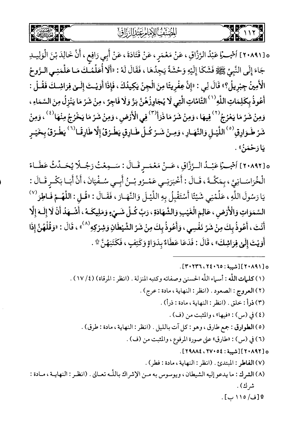 ° [٢٠٨٩١] أخبرنا عَبْدُ الرَّزَّاقِ، عَنْ مَعْمَرٍ، عَنْ قَتَادَةَ، عَنْ أَبِي رَافِعٍ، أَنَّ خَالِدَ بْنَ الْوَلِيدِ جَاءَ إِلَى النَّبِيِّ - صلى الله عليه وسلم - فَشَكَا إِلَيْهِ وَحْشَةً يَجِدُهَا، فَقَالَ لَهُ: "أَلَا أُعَلِّمُكَ مَا عَلَّمَنِي الرُّوحُ الْأَمِينُ جِبْرِيلُ؟ " قَالَ لِي: "إِنَّ عِفْرِيتًا مِنَ الْجِنِّ يَكِيدُكَ، فَإِذَا أَوَيْتَ إِلَى فِرَاشِكَ فَقُلْ: أَعُوذُ بِكَلِمَاتِ اللَّهِ (¬١) التَّامَّاتِ الَّتِي لَا يُجَاوِزُهُنَّ بَرٌّ وَلَا فَاجِرٌ، مِنْ شَرِّ مَا يَنْزِلُ مِنَ السَّمَاءِ، وَمِنْ شَرِّ مَا يَعْرُجُ (¬٢) فِيهَا، وَمِنْ شَرِّ مَا ذَرَأَ (¬٣) فِي الْأَرْضِ، وَمِنْ شَرِّ مَا يَخْرُجُ مِنْهَا (¬٤)، وَمِنْ شَرِّ طَوَارِقِ (¬٥) اللَّيْلِ وَالنَّهَارِ، وَمِنْ شَرِّ كلِّ طَارِقٍ يَطْرُقُ إِلَّا طَارِقًا (¬٦) يَطْرُقُ بِخَيْرٍ يَا رَحْمَنُ".