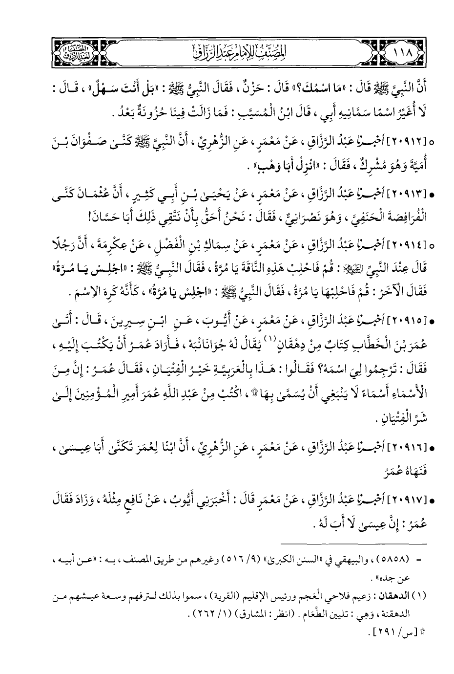 ° [٢٠٩١٢] أخبرنا عَبْدُ الرَّزَّاقِ، عَنْ مَعْمَرٍ، عَنِ الزُّهْرِيِّ، أَنَّ النَّبِيَّ - صلى الله عليه وسلم - كنَّي صَفْوَانَ بْنَ أُمَيَّةَ وَهُوَ مُشْرِكٌ، فَقَالَ: "انْزِلْ أَبَا وَهْبٍ".