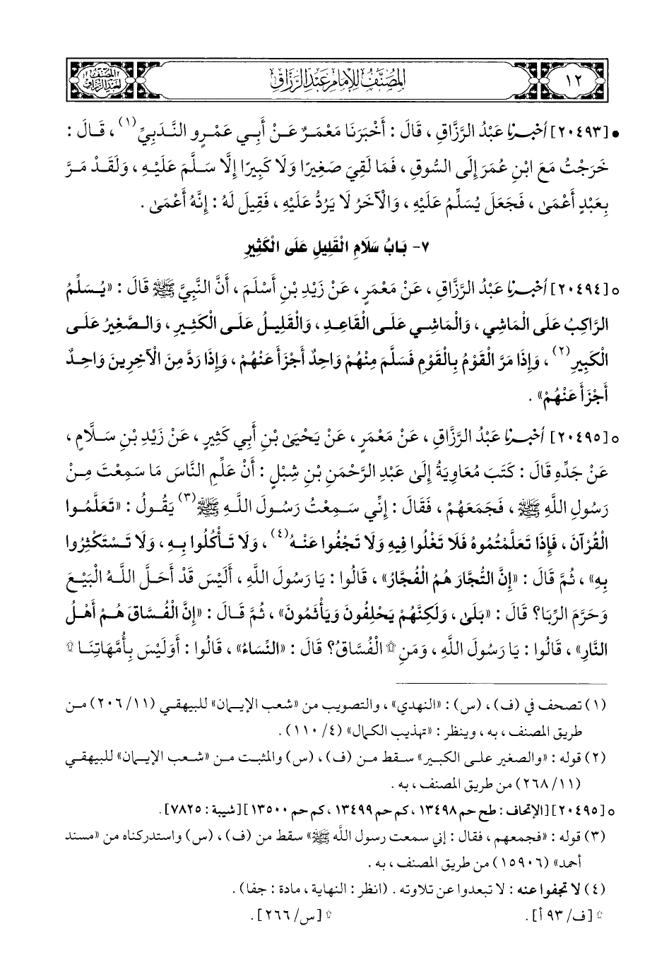 ° [٢٠٤٩٤] أخبرنا عَبْدُ الرَّزَّاقِ، عَنْ مَعْمَرٍ، عَنْ زَيْدِ بْنِ أَسْلَمَ، أَنَّ النَّبِيَّ - صلى الله عليه وسلم - قَالَ: "يُسَلِّمُ الرَّاكِبُ عَلَى الْمَاشِي، وَالْمَاشِي عَلَى الْقَاعِدِ، وَالْقَلِيلُ عَلَى الْكَثِيرٍ، وَالصَّغِيرُ عَلَى الْكَبِيرِ (¬٢)، وَإِذَا مَرَّ الْقَوْمُ بِالْقَوْمِ فَسَلَّمَ مِنْهُمْ وَاحِدٌ أَجْزَأَ عَنْهُمْ، وَإِذَا رَدَّ مِنَ الْآخِرِينَ وَاحِدٌ أَجْزَأَ عَنْهُمْ".