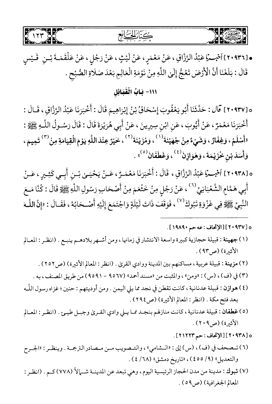 ° [٢٠٩٣٧] قال: حَدَّثَنَا أَبُو يَعْقُوبَ إِسحَاقُ بْنُ إِبْرَاهِيمَ قَالَ: أَخْبَرَنَا عَبْدُ الرَّزَّاقِ، قَالَ: أَخْبَرَنَا مَعْمَرٌ، عَنْ أَيُّوبَ، عَنِ ابْنِ سِيرِينَ، عَنْ أَبِي هُرَيْرَةَ قَالَ: قَالَ رَسُولُ اللَّهِ - صلى الله عليه وسلم -: "أسْلم، وَغِفَارٌ، وَشَيْءٌ مِن جُهَيْنَة (¬١)، وَمُزَيْنَة (¬٢)، خيْرٌ عِنْدَ اللهِ يَوْمَ القِيَامَةِ مِنْ (¬٣) تَمِيمَ، وَأَسَدَ بْنِ خُزَيْمَةَ، وَهَوَازِنَ (¬٤)، وَغَطَفَانَ (¬٥) ".