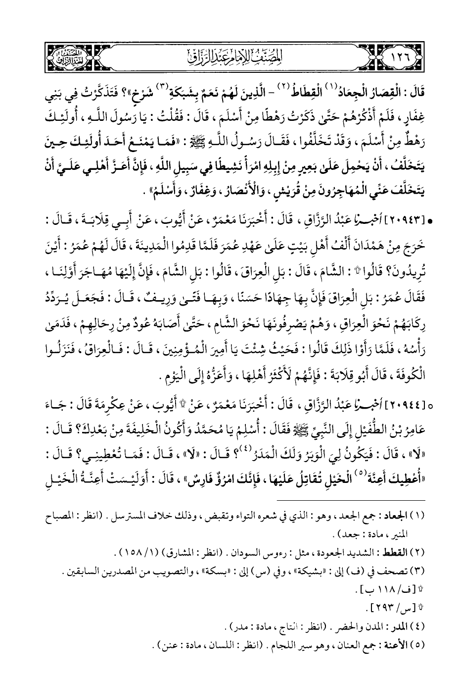 • [٢٠٩٤٣] أخبرنا عَبْدُ الرَّزَّاقِ، قَالَ: أَخْبَرَنَا مَعْمَرٌ، عَنْ أَيُّوبَ، عَنْ أَبِي قِلَابَةَ، قَالَ: خَرَجَ مِنْ هَمْدَانَ أَلفُ أَهْلِ بَيْتٍ عَلَي عَهْدِ عُمَرَ فَلَمَّا قَدِمُوا الْمَدِينَةَ، قَالَ لَهُمْ عُمَرُ: أَيْنَ تُرِيدُونَ؟ قَالُوا *: الشَّامَ، قَالَ: بَلِ الْعِرَاقَ، قَالُوا: بَلِ الشَّامَ، فَإِنَّ إِلَيْهَا مُهَاجَرَ أَوَّلِنَا، فَقَالَ عُمَرُ: بَلِ الْعِرَاقَ فَإِنَّ بِهَا جِهَادًا حَسَنًا، وَبِهَا فَتى وَرِيفٌ، قَالَ: فَجَعَلَ يُرَدِّدُ رِكَابَهُمْ نَحْوَ الْعِرَاقِ، وَهُمْ يَصْرِفُونَهَا نَحْوَ الشَّامِ، حَتَّى أَصابَهُ عُودٌ مِنْ رِحَالِهِمْ، فَدَمَى رَأْسُه، فَلَمَّا رَأَوْا ذَلِكَ قَالُوا: فَحَيْثُ شِئْتَ يَا أَمِيرَ الْمُؤْمِنِينَ، قَالَ: فَالْعِرَاق، فَنَزَلُوا الْكُوفَةَ، قَالَ أَبُو قِلَابَةَ: فَإِنَّهُمْ لأَكْثَرُ أَهْلِهَا، وَأَعَزُّهُ إِلَى الْيَوْمِ.