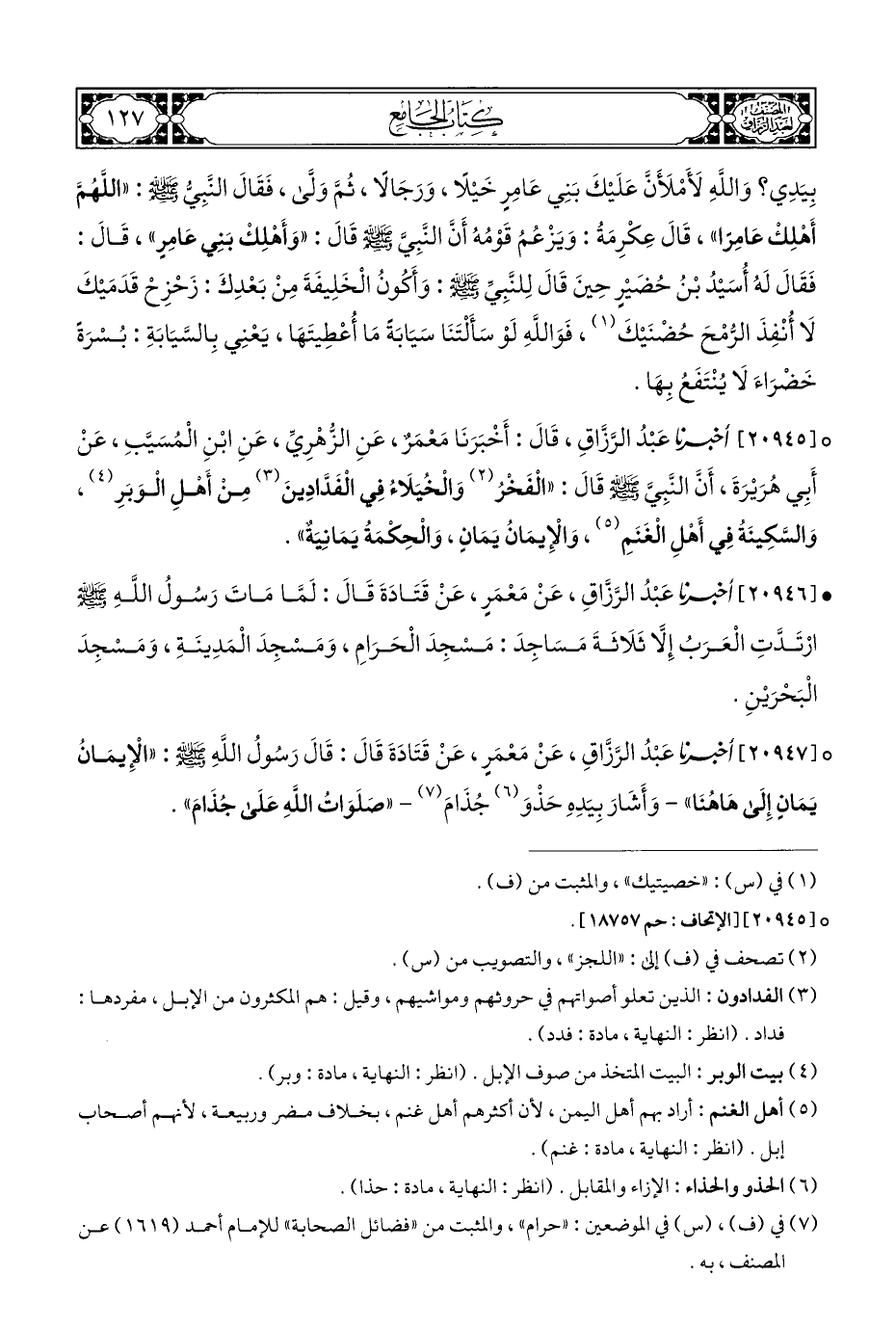° [٢٠٩٤٥] أخبرنا عَبْدُ الرَّزَّاقِ، قَالَ: أَخْبَرَنَا مَعْمَرٌ، عَنِ الزُّهْرِيِّ، عَنِ ابْنِ الْمُسَيَّبِ، عَنْ أَبِي هُرَيْرَةَ، أَنَّ النَّبِيَّ - صلى الله عليه وسلم - قَالَ: "الْفَخْرُ (¬٢) وَالْخُيَلَاءُ فِي الْفَدَّادِينَ (¬٣) مِنْ أَهْلِ الْوَبَرِ (¬٤)، وَالسَّكِينَةُ فِي أَهْلِ الْغَنَمِ (¬٥)، وَالْإِيمَانُ يَمَانٍ، وَالْحِكْمَةُ يَمَانِيَةٌ".