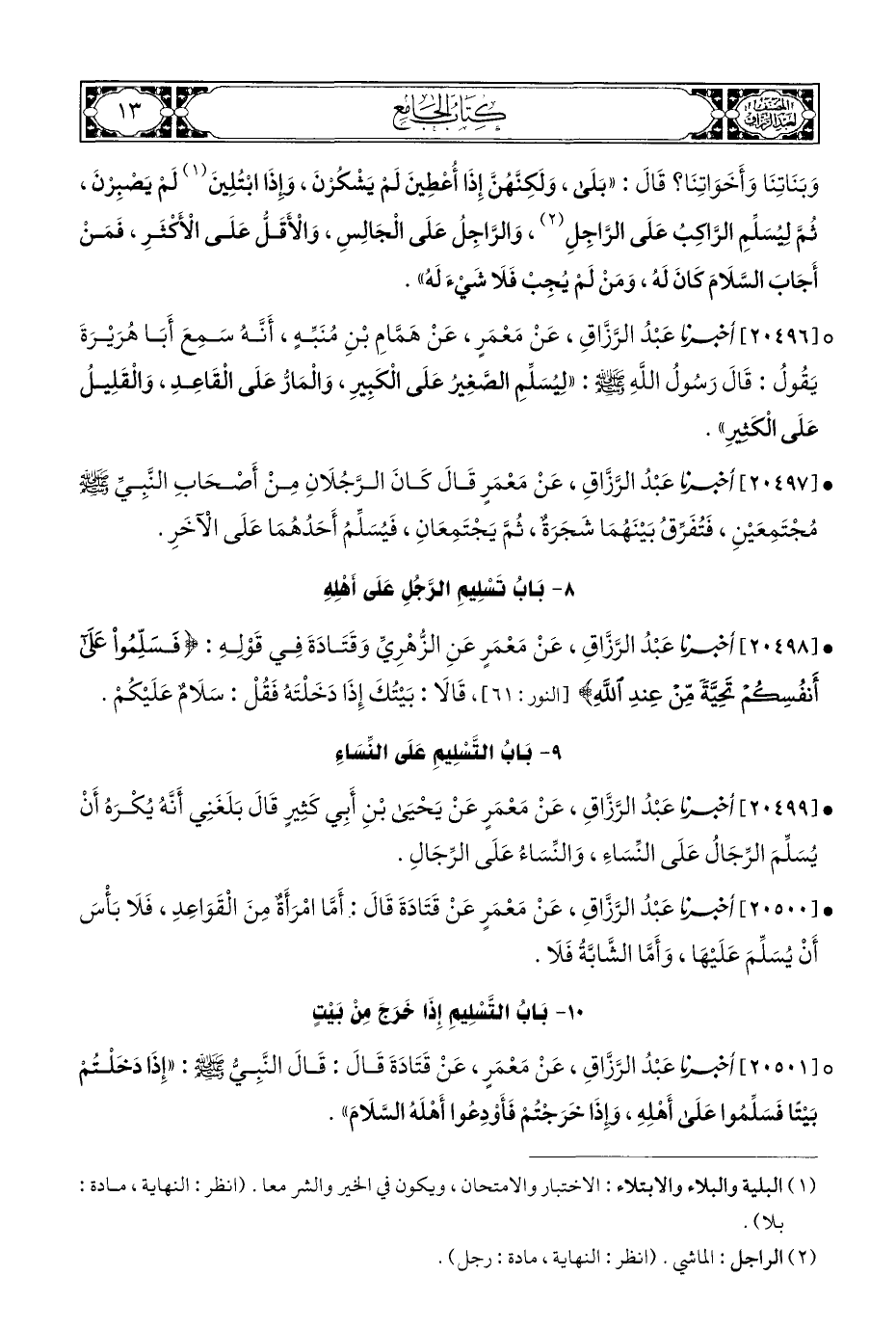° [٢٠٤٩٦] أخبرنا عَبْدُ الرَّزَّاقِ، عَنْ مَعْمَرٍ، عَنْ هَمَّامِ بْنِ مُنَبِّهٍ، أَنَّهُ سَمِعَ أَبَا هُرَيْرَةَ يَقُول: قَالَ رَسُولُ اللهِ - صلى الله عليه وسلم -: "لِيُسَلِّمِ الصَّغِيرُ عَلَى الْكَبِيرِ، وَالْمَارُّ عَلَى الْقَاعِدِ، وَالقَلِيلُ عَلَى الْكَثِيرِ".