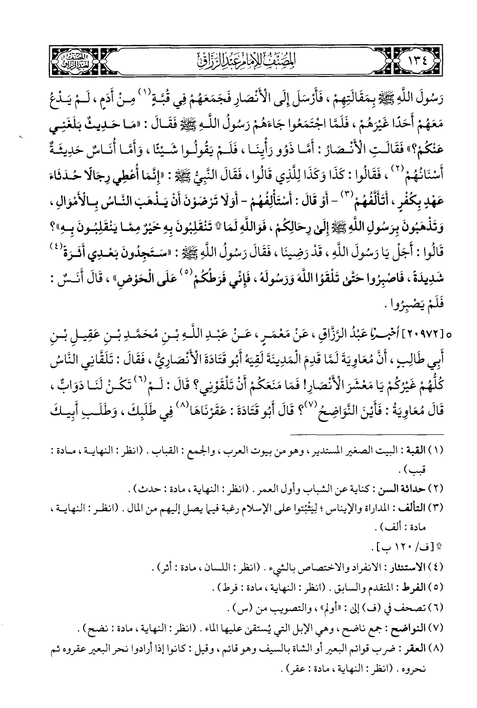 ° [٢٠٩٧٢] أخبرنا عَبْدُ الرَّزَّاقِ، عَنْ مَعْمَرٍ، عَنْ عَبْدِ اللَّهِ بْنِ مُحَمَّدِ بْنِ عَقِيلِ بْنِ أَبِي طَالِبٍ، أَنَّ مُعَاوِيَةَ لَمَّا قَدِمَ الْمَدِينَةَ لَقِيَهُ أَبُو قَتَادَةَ الْأَنْصَارِيُّ، فَقَالَ: تَلَقَّانِي النَّاسُ كُلُّهُمْ غَيْرُكُمْ يَا مَعْشَرَ الْأَنْصَارِ! فَمَا مَنَعَكُمْ أَنْ تَلْقَوْنِي؟ قَالَ: لَمْ (¬٦) تَكنْ لَنَا دَوَابٌّ، قَالَ مُعَاوِيَةُ: فَأَيْنَ النَّوَاضِحُ (¬٧)؟ قَالَ أَبُو قَتَادَةَ: عَقَرْنَاهَا (¬٨) فِي طَلَبِكَ، وَطَلَبِ أَبِيكَ