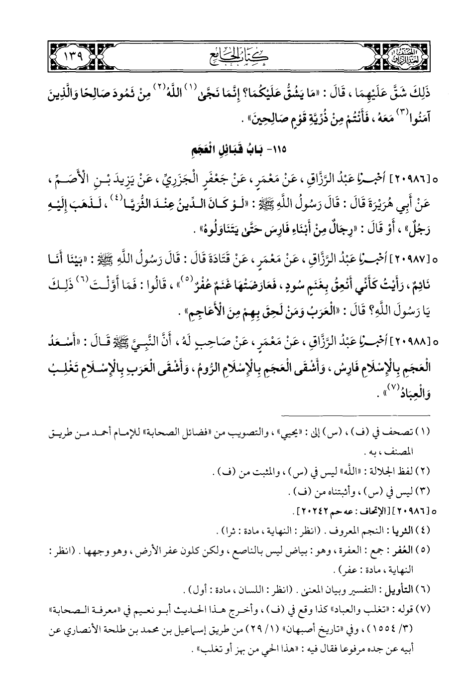 ° [٢٠٩٨٨] أخبرنا عَبْدُ الرَّزَّاقِ، عَنْ مَعْمَرٍ، عَنْ صاحِبٍ لَه، أَنَّ النَّبِيَّ - صلى الله عليه وسلم - قَالَ: "أَسْعَدُ الْعَجَمِ بِالْإِسْلَامِ فَارِسُ، وَأَشْقَى الْعَجَمِ بِالْإِسْلَامِ الرُّوم، وَأَشْقَى الْعَرَبِ بِالْإِسْلَامِ تَغْلِبُ وَالْعِبَادُ (¬٧) ".