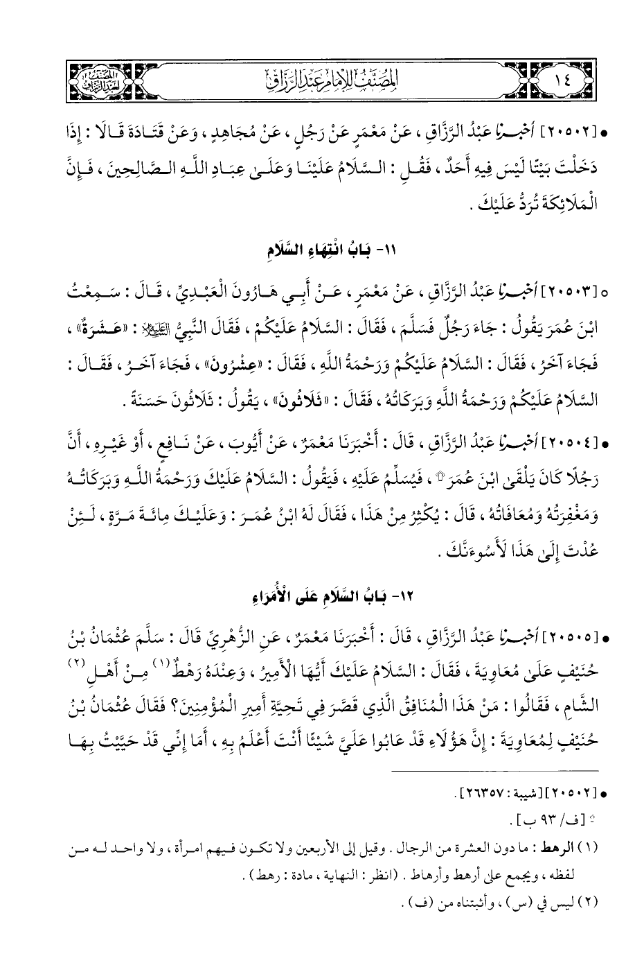 • [٢٠٥٠٤] أخبرنا عَبْدُ الرَّزَّاقِ، قَالَ: أَخْبَرَنَا مَعْمَرٌ، عَنْ أَيُّوبَ، عَنْ نَافِعٍ، أَو غَيْرِهِ، أَنَّ رَجُلًا كَانَ يَلْقَى ابْنَ عُمَرَ (*)، فَيُسَلِّمُ عَلَيْهِ، فَيَقُولُ: السَّلَامُ عَلَيْكَ وَرَحْمَةُ اللهِ وَبَرَكَاتُهُ وَمَغْفِرَتُهُ وَمُعَافَاتُه، قَالَ: يُكْثِرُ مِنْ هَذَا، فَقَالَ لَهُ ابْنُ عُمَرَ: وَعَلَيْكَ مِائَةَ مَرَّةٍ، لَئِنْ عُدْتَ إِلَى هَذَا لأَسُوءنَّكَ.