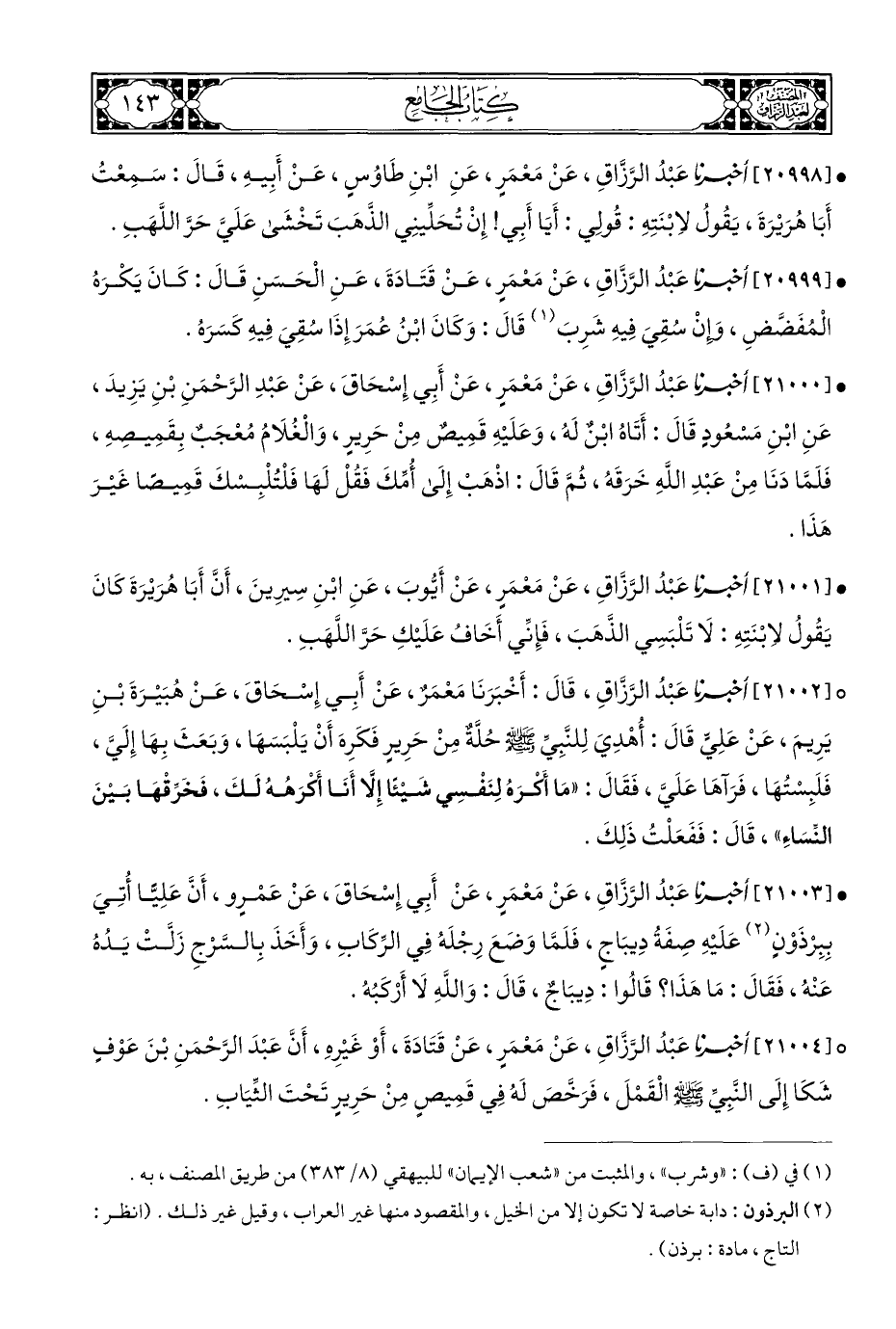 • [٢١٠٠٣] أخبرنا عَبْدُ الرَّزَّاقِ، عَنْ مَعْمَرٍ، عَنْ أَبِي إِسْحَاقَ، عَنْ عَمْرٍو، أَنَّ عَلِيًّا أُتِيَ بِبِرْدَوْنٍ (¬٢) عَلَيْهِ صِفَةُ دِيبَاجٍ، فَلَمَّا وَضَعَ رِجْلَهُ فِي الرِّكَابِ، وَأَخَذَ بِالسَّرْجِ زَلَّتْ يَدُهُ عَنْه، فَقَالَ: مَا هَذَا؟ قَالُوا: دِيبَاجٌ، قَالَ: وَاللَّهِ لَا أَرْكَبُهُ.