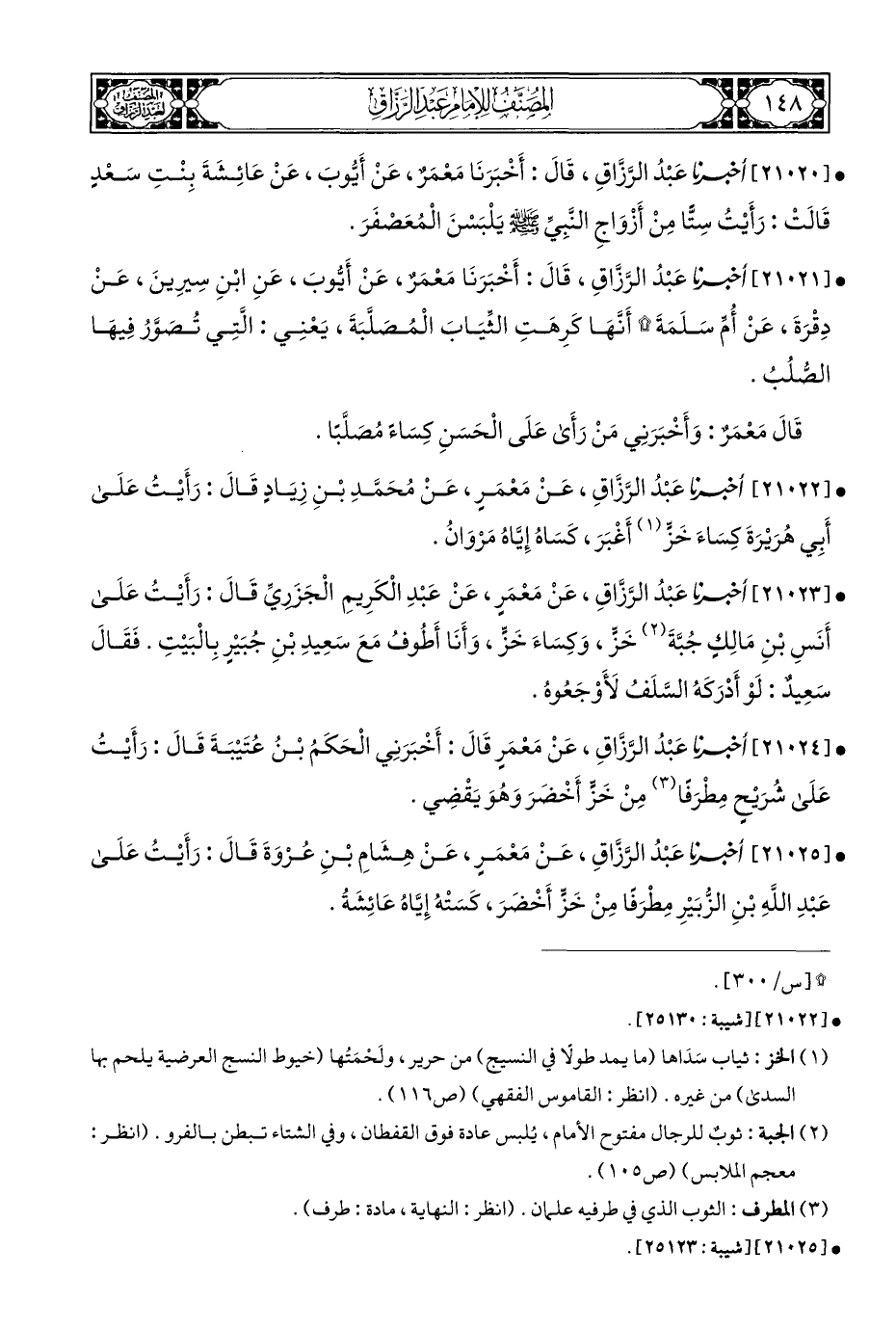 • [٢١٠٢٠] أخبرنا عَبْدُ الرَّزَّاقِ، قالَ: أَخْبَرَنَا مَعْمَرٌ، عَنْ أَيُّوبَ، عَنْ عَائِشَةَ بِنْتِ سَعْدٍ قَالَتْ: رَأَيْتُ سِتًّا مِنْ أَزْوَاجِ النَّبِيِّ - صلى الله عليه وسلم - يلْبَسْنَ الْمُعَصْفَرَ.