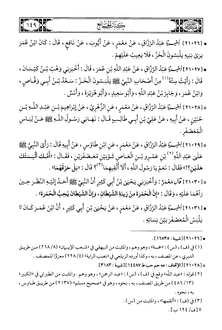 ° [٢١٠٣٠] قال مَعْمَر: وَأَخْبَرَنِي يَحْيَى بْنُ أَبِي كَثِير أَنَّ النَّبِيَّ - صلى الله عليه وسلم - أَحَدَّ إِلَيْهِ النَّظَرَ حِينَ رَآهُمَا عَلَيْهِ، وَقَالَ: "إِنَّ الْحُمْرَةَ مِنْ زِينَةِ الشَّيْطَانِ، وإنَّ الشَّيْطَانَ يُحِبُّ الْحُمْرَةَ".