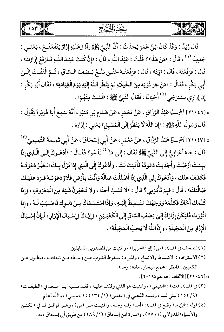 ° [٢١٠٤٦] أخبرنا عَبْدُ الرَّزَّاقِ، عَنْ مَعْمَرٍ، عَنْ هَمَّامِ بْنِ مُنَبَّهٍ، أَنَّهُ سَمِعَ أَبَا هُرَيْرَةَ يَقُولُ: قَالَ رَسُولُ اللَّهِ - صلى الله عليه وسلم -: "إِنَّ اللهَ لَا يَنْظُرُ إِلَى الْمُسْبِلِ" يَعْنِي: إِزَارَهُ.