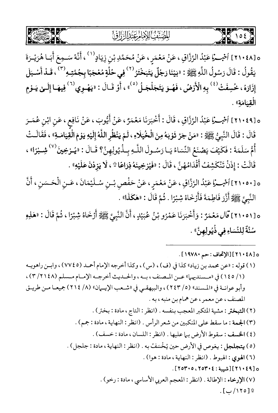 ° [٢١٠٤٨] أخبرنا عَبْدُ الرَّزَّاقِ، عَنْ مَعْمَرٍ، عَنْ مُحَمَّدِ بْنِ زِيَادٍ (¬١)، أَنَّهُ سَمِعَ أَبَا هُرَيْرَةَ يَقُولُ: قَالَ رَسُولُ اللَّهِ - صلى الله عليه وسلم -: "بَيْنَا رَجُلٌ يَتَبَخْتَرُ (¬٢) فِي حُلَّةٍ مُعْجَبًا بِجُمَّتِهِ (¬٣)، قَدْ أَسْبَلَ إِزَارَه، خُسِفَتْ (¬٤) بِهِ الْأَرْض، فَهُوَ يَتَجَلْجَلُ (¬٥) "، أَوْ قَالَ: "يَهْوِي (¬٦) فِيهَا إِلَى يَوْمِ الْقِيَامَةِ".