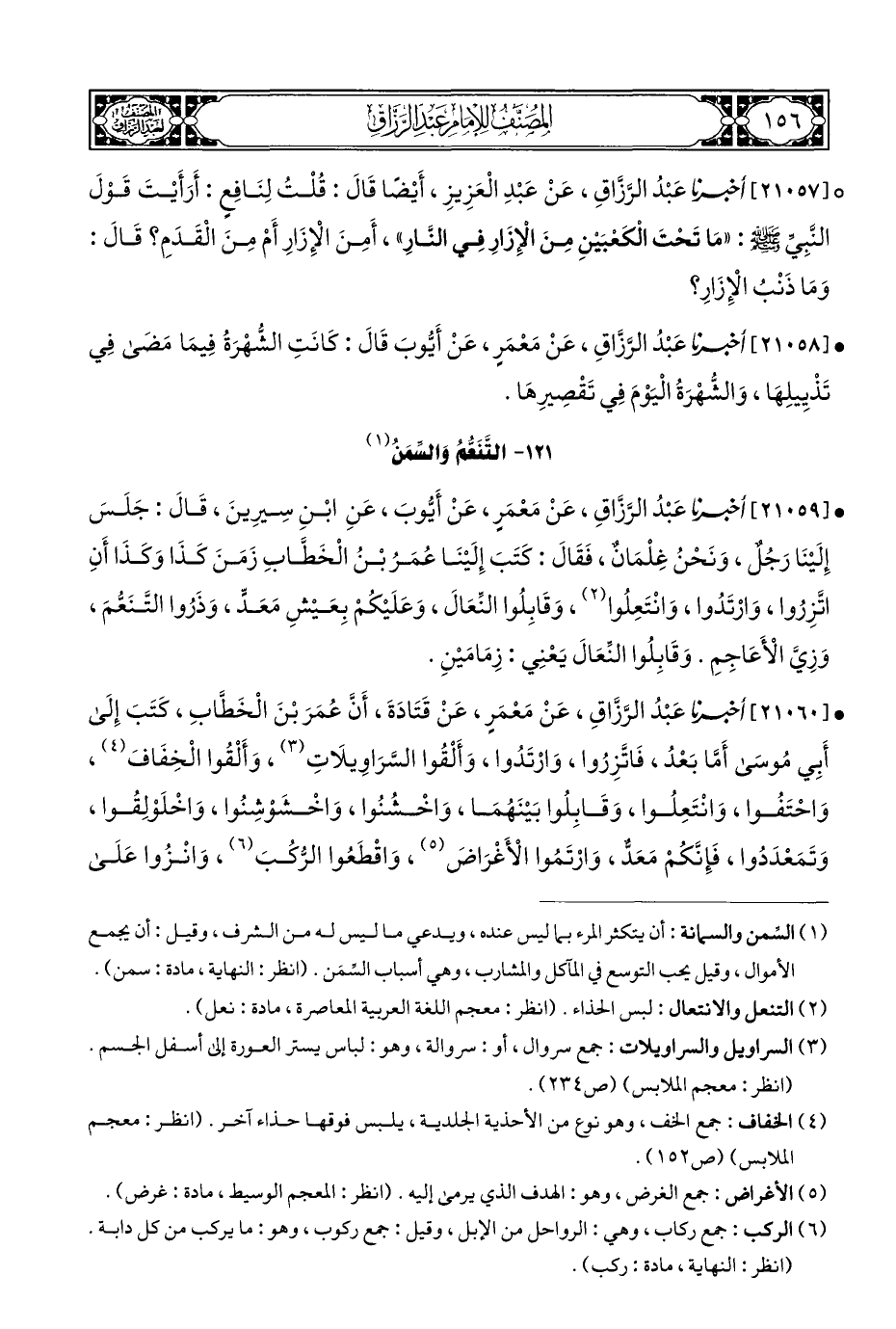 • [٢١٠٥٩] أخبرنا عَبْدُ الرَّزَّاقِ، عَنْ مَعْمَرٍ، عَنْ أَيُّوبَ، عَنِ ابْنِ سِيرِينَ، قَالَ: جَلَسَ إِلَيْنَا رَجُلٌ، وَنَحْنُ غِلْمَانٌ، فَقَالَ: كَتَبَ إِلَيْنَا عُمَرُ بْنُ الْخَطَّابِ زَمَنَ كَذَا وَكَذَا أَنِ اتَّزِرُوا، وَارْتَدُوا، وَانْتَعِلُوا (¬٢)، وَقَابِلُوا النِّعَالَ، وَعَلَيْكُمْ بِعَيْشِ مَعَدٍّ، وَذَرُوا التَّنَعُّمَ، وَزِيَّ الْأَعَاجِمِ. وَقَابِلُوا النِّعَالَ يَعْنِي: زِمَامَيْنِ.