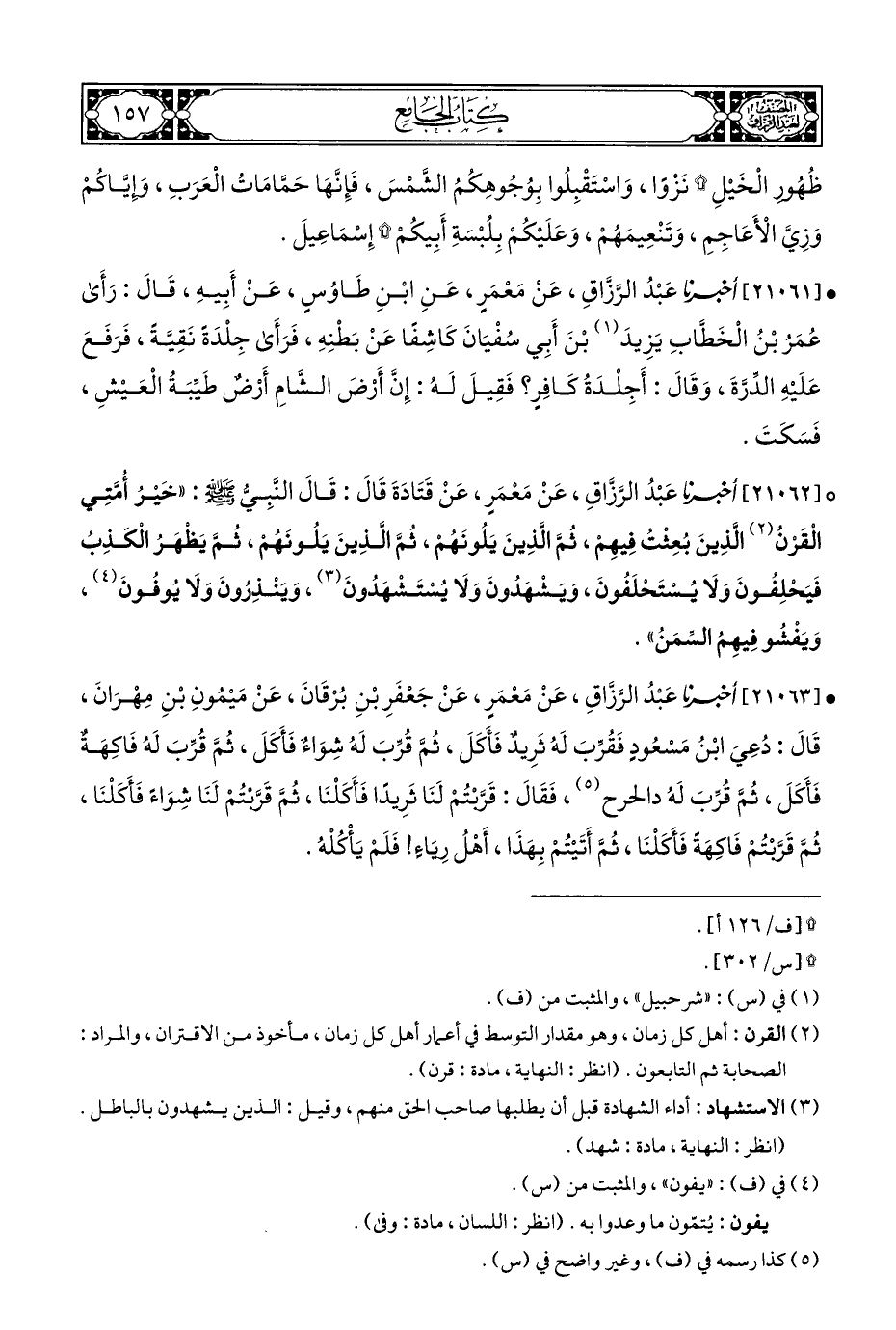 (¬٢) القرن: أهل كل زمان، وهو مقدار التوسط في أعمار أهل كل زمان، مأخوذ من الاقتران، والمراد: الصحابة ثم التابعون. (انظر: النهاية، مادة: قرن).