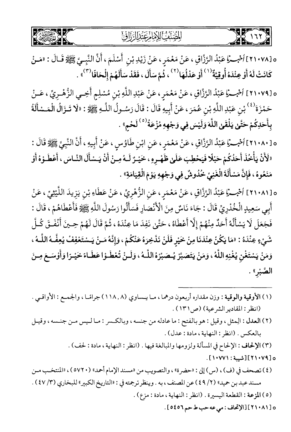 ° [٢١٠٧٨] أخبرنا عَبْدُ الرَّزَّاقِ، عَنْ مَعْمَرٍ، عَنْ زَيْدِ بْنِ أَسْلَمَ، أَنَّ النَّبِيَّ - صلى الله عليه وسلم - قَالَ: "مَنْ كَانَتْ لَهُ أَوْ عِنْدَهُ أُوقِيَّةٌ (¬١) أَوْ عَدْلُهَا (¬٢)، ثُمَّ سَأَلَ، فَقَدْ سَأَلَهُمْ إِلْحَافًا (¬٣) ".