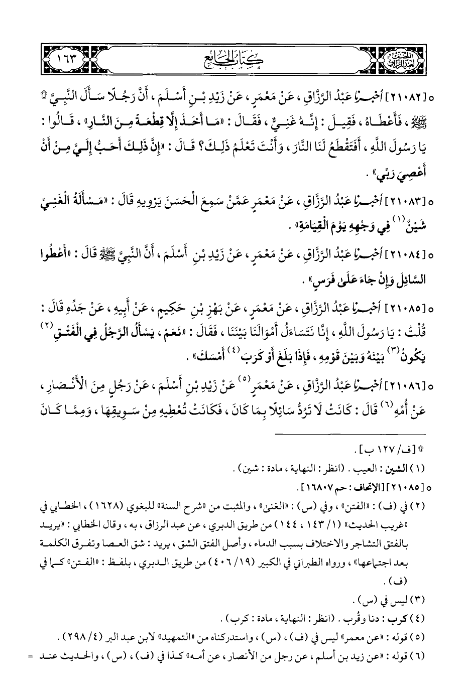 ° [٢١٠٨٣] أخبرنا عَبْدُ الرَّزَّاقِ، عَنْ مَعْمَرٍ عَمَّنْ سَمِعَ الْحَسَنَ يَرْويهِ قَالَ: "مَسْأَلَةُ الْغَنِيِّ شيْنٌ (¬١) فِي وَجْهِهِ يَوْمَ القِيَامَةِ".