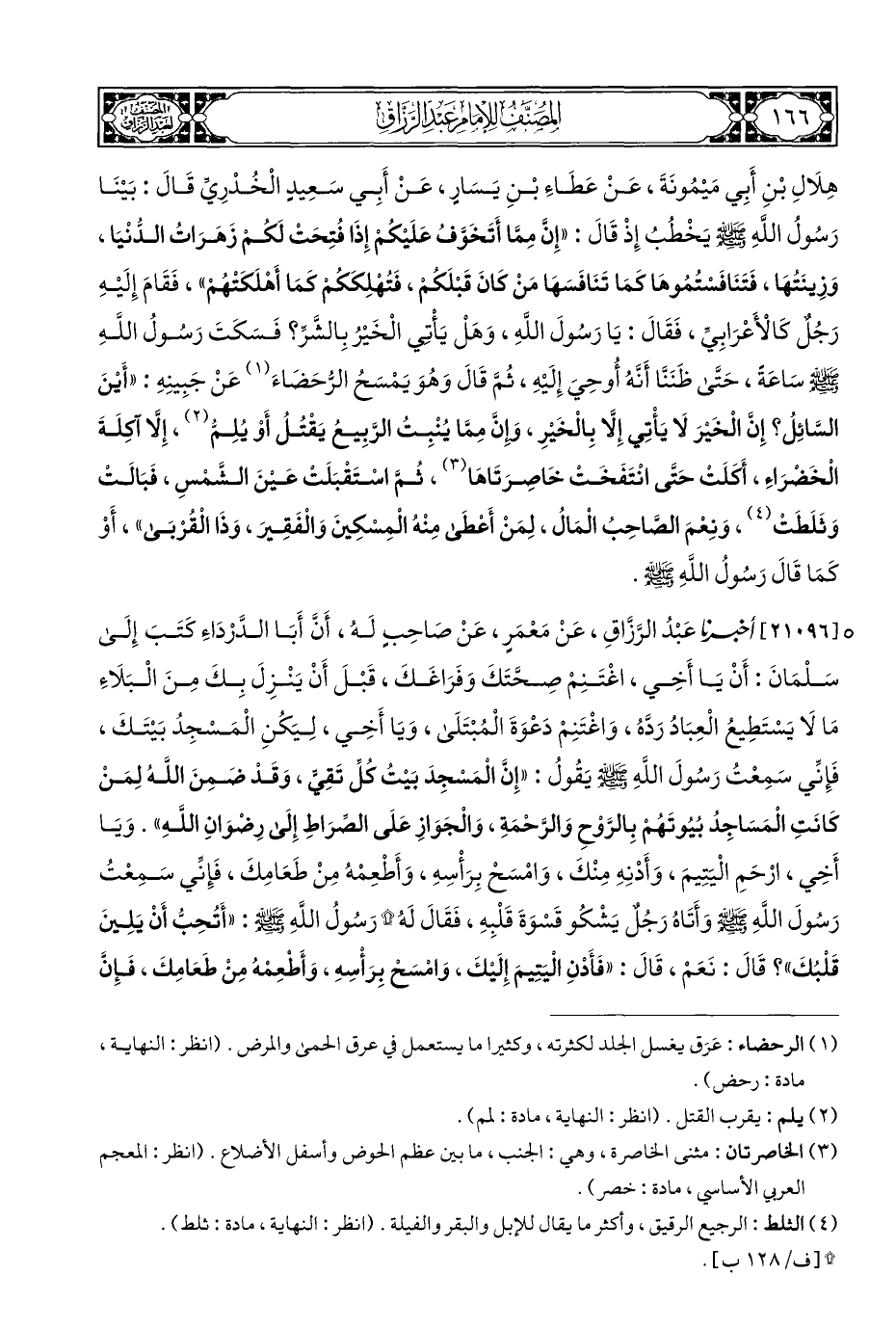 هِلَالِ بْنِ أَبِي مَيْمُونَةَ، عَنْ عَطَاءٍ بْنِ يَسَارٍ، عَنْ أَبِي سَعِيدٍ الْخُدْرِيِّ قَالَ: بَيْنَا رَسُولُ اللهِ - صلى الله عليه وسلم - يخْطُبُ إِذْ قَالَ: "إِنَّ مِمَّا أَتَخَوَّفُ عَلَيْكُمْ إِذَا فُتِحَتْ لَكُمْ زَهَرَاتُ الدُّنْيَا، وَزِينَتُهَا، فَتَنَافَسْتُمُوهَا كمَا تَنَافَسَهَا مَنْ كَانَ قَبْلَكُمْ، فَتُهْلِكَكُمْ كَمَا أَهْلَكَتْهُمْ"، فَقَامَ إِلَيْهِ رَجُلٌ كَالْأَعْرَابِيِّ، فَقَالَ: يَا رَسُولَ اللَّهِ، وَهَلْ يَأْتي الْخَيْرُ بِالشَّرِّ؟ فَسَكَتَ رَسُولُ اللَّهِ - صلى الله عليه وسلم - سَاعَةً، حَتَّى ظَنَنَّا أَنَّهُ أُوحِيَ إِلَيْهِ، ثُمَّ قَالَ وَهُوَ يَمْسَحُ الرُّحَضَاءَ (¬١) عَنْ جَبِينِهِ: "أَيْنَ السَّائِلُ؟ إِنَّ الْخَيْرَ لَا يَأْتِي إِلَّا بِالْخَيْرِ، وَإِنَّ مِمَّا يُنْبِتُ الرَّبِيعُ يَقْتُلُ أَوْ يُلِمُّ (¬٢)، إِلَّا آكِلَةَ الْخَضْرَاءِ، أَكَلَتْ حَتَّى انْتَفَخَتْ خَاصِرَتَاهَا (¬٣)، ثُمَّ اسْتَقْبَلَتْ عَيْنَ الشَّمْسِ، فَبَالَتْ وَثَلَطَتْ (¬٤)، وَنِعْمَ الصَّاحِبُ الْمَالُ، لِمَنْ أَعْطَى مِنْهُ الْمِسْكِينَ وَالْفَقِيرَ، وَذَا الْقُرْبَى"، أَوْ كَمَا قَالَ رَسُولُ اللَّهِ - صلى الله عليه وسلم -.