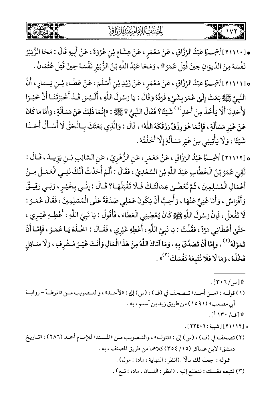 ° [٢١١١٢] أَخْبَرَنَا عَبْدُ الرَّزَّاقِ، عَنْ مَعْمَرٍ، عَنِ الزُّهْرِيِّ، عَنِ السَّائِبِ بْنِ يَزِيدَ، قَالَ: لَقِيَ عُمَرُ بْنُ الْخَطابِ عَبْدَ اللَّهِ بْنَ السَّعْدِيِّ، فَقَالَ: أَلَمْ أُحَدَّثْ أَنَّكَ تَلِي الْعَمَلَ مِنْ أَعْمَالِ الْمُسْلِمِينَ، ثُمَّ تُعْطَى عِمَالَتَكَ فَلَا تَقْبَلُهَا؟ قَالَ: إِنِّي بِخَيْرِ، وَلِي رَقِيقٌ وَأَفْرَاسٌ، وَأَنَا غَنِىٌ عَنْهَا، وَأُحِبُّ أَنْ يَكُونَ عَمَلِي صَدَقَةً عَلَى الْمُسْلِمِينَ، فَقَالَ عُمَرُ: لَا تَفْعَلْ، فَإِنَّ رَسُولَ اللَّهِ - صلى الله عليه وسلم - كانَ يُعْطِينِي الْعَطَاءَ، فَأَقُولُ: يَا نَبِيَّ اللَّهِ، أَعْطِهِ غَيْرِي، حَتَّى أَعْطَانِي مَرَّةً، فَقُلْتُ: يَا نَبِيَّ اللَّهِ، أَعْطِهِ غَيْرِي، فَقَالَ: "خُذْهُ يَا عُمَرُ، فَإِمَّا أَنْ تَمَوَّلَهُ (¬٢)، وَاِمَّا أَنْ تَصَدَّقَ بِهِ، وَمَا آتَاكَ اللَّهُ مِنْ هَذَا الْمَالِ وَأَنْتَ غَيْرُ مُشْرِفٍ، وَلَا سَائِلٍ فَخُذْهُ، وَمَا لَا فَلَا تُتْبِعْهُ نَفْسَكَ (¬٣) ".