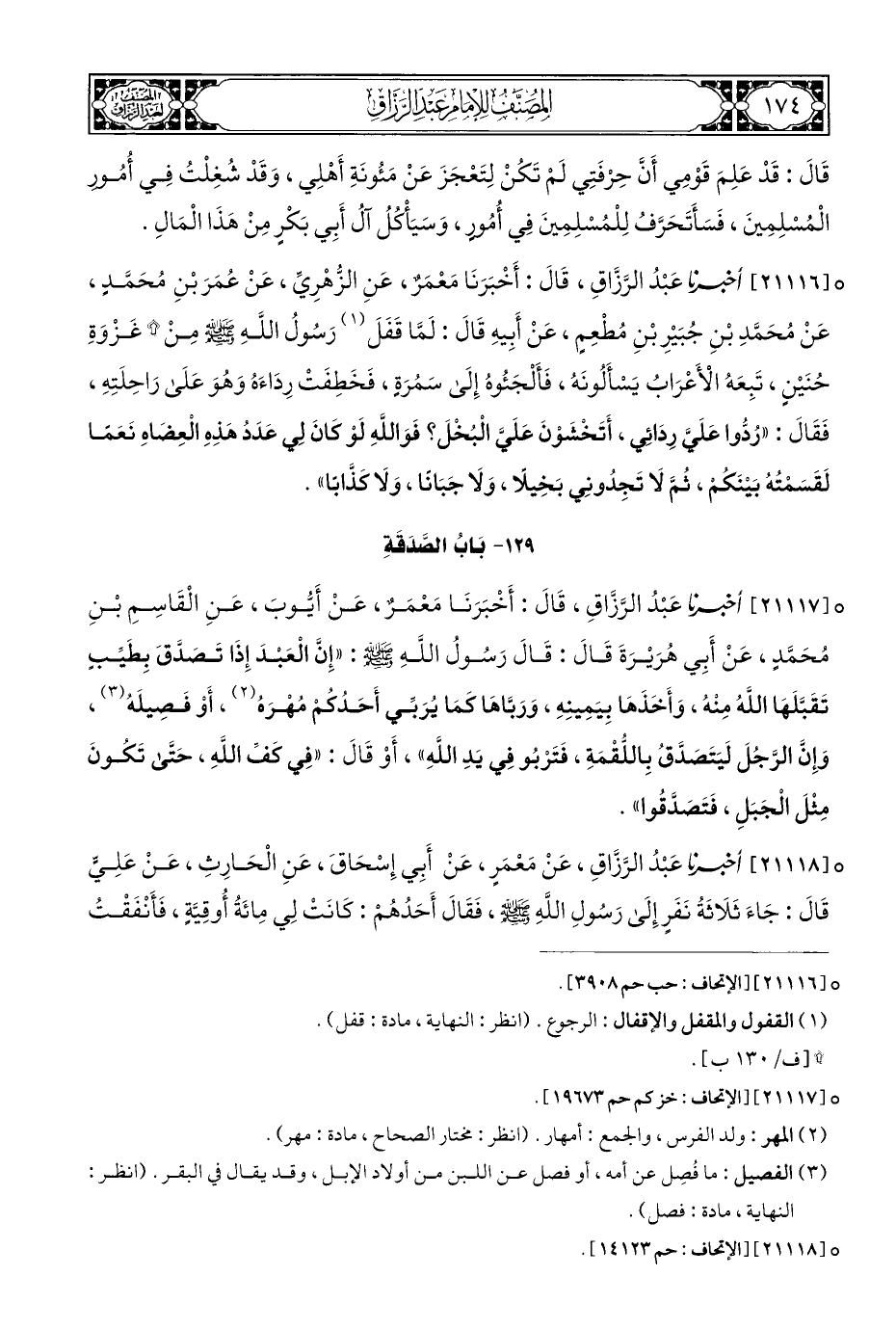 ° [٢١١١٨] أَخْبَرَنَا عَبْدُ الرَّزَّاقِ، عَنْ مَعْمَرٍ، عَنْ أَبِي إِسْحَاقَ، عَنِ الْحَارِثِ، عَنْ عَلِيٍّ قَالَ: جَاءَ ثَلَاثَةُ نَفَرٍ إِلَى رَسُولِ اللَّهِ - صلى الله عليه وسلم -، فَقَالَ أَحَدُهُمْ: كَانَتْ لِي مِائَةُ أُوقِيَّةٍ، فَأَنْفَقْتُ
