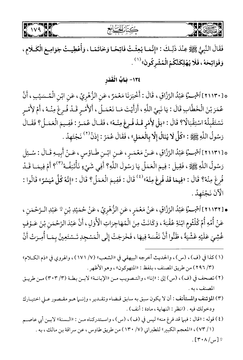 ° [٢١١٣٠] أَخْبَرَنَا عَبْدُ الرَّزَّاقِ، قَالَ: أَخْبَرَنَا مَعْمَرٌ، عَنِ الزُّهْرِيِّ، عَنِ ابْنِ الْمُسَيَّبِ، أَنَّ عُمَرَ بْنَ الْخَطَّابِ قَالَ: يَا نَبِيَّ اللَّهِ، أَرَأَيْتَ مَا نَعْمَلُ، أَلِأَمْرٍ قَدْ فُرِغَ مِنْهُ، أَمْ لِأَمْرٍ نَسْتَقْبِلُهُ اسْتِقْبَالًا؟ قَالَ: "بَل لِأَمْير قَدْ فُرِغَ مِنْهُ"، فَقَالَ عُمَرُ: فَفِيمَ الْعَمَلُ؟ فَقَالَ رَسُولُ اللَّهِ - صلى الله عليه وسلم -: "كُلٌّ لَا يُنَالُ إِلَّا بِالْعَمَلِ"، فَقَالَ عُمَرُ: إِذَنْ (¬٢) نَجْتَهِدُ.