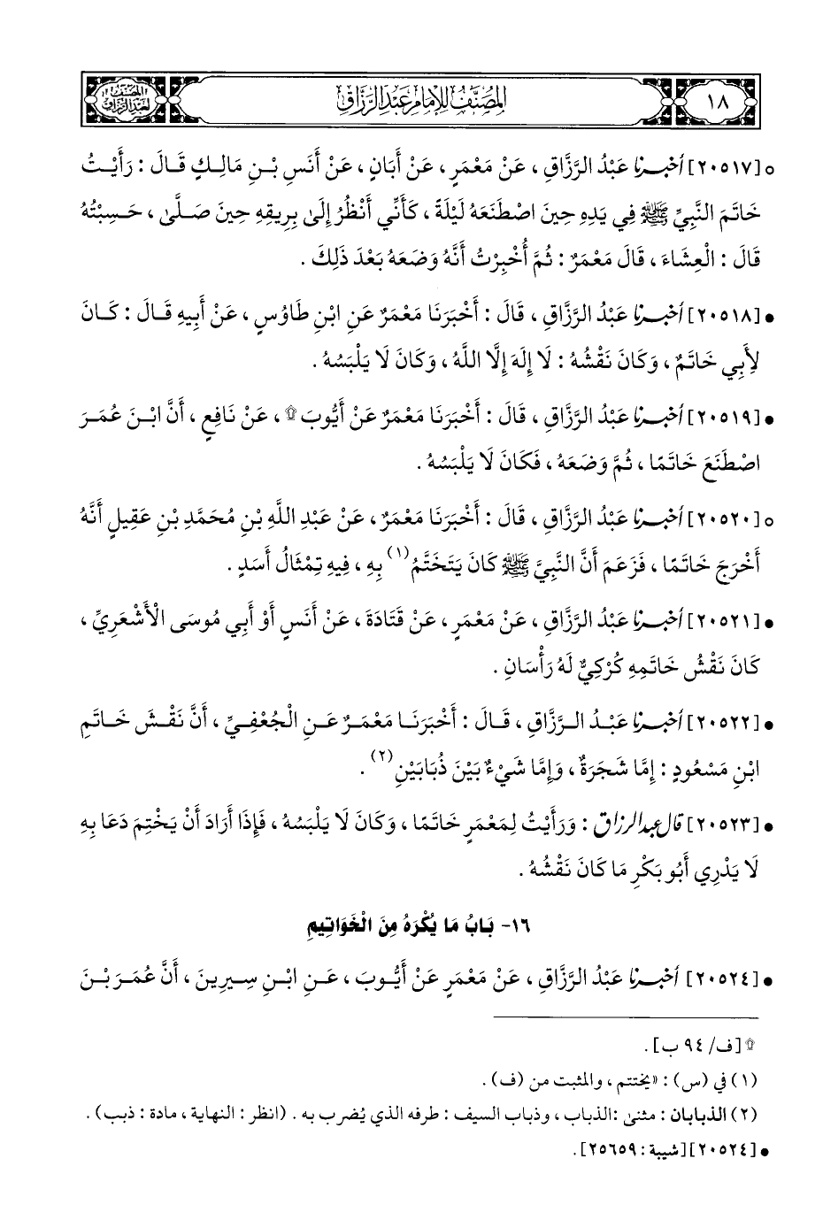 ° [٢٠٥١٧] أخبرنا عَبْدُ الرَّزَّاقِ، عَنْ مَعْمَرٍ، عَنْ أَبَانٍ، عَنْ أَنَسِ بْنِ مَالِكٍ قَالَ: رَأَيْتُ خَاتَمَ النَّبِيِّ - صلى الله عليه وسلم - فِي يَدِهِ حِينَ اصطَنَعَهُ لَيْلَةً، كَأَنِّي أَنْظُرُ إِلَى بِرِيقِهِ حِينَ صَلَّى، حَسِبْتُهُ قَالَ: الْعِشَاءَ، قَالَ مَعْمَرٌ: ثُمَّ أُخْبِرْتُ أَنَّهُ وَضَعَهُ بَعْدَ ذَلِكَ.
