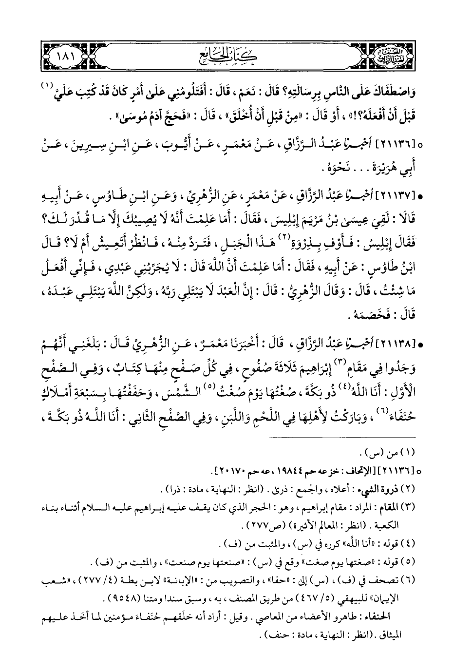 • [٢١١٣٨] أَخْبَرَنَا عَبْدُ الرَّزَّاقِ، قَالَ: أَخْبَرَنَا مَعْمَرٌ، عَنِ الزُّهْرِيِّ قَالَ: بَلَغَنِي أَنَّهُمْ وَجَدُوا فِي مَقَامِ (¬٣) إِبْرَاهِيمَ ثَلَاثَةَ صُفُوحٍ، فِي كُلِّ صفْحٍ مِنْهَا كِتَابٌ، وَفِي الصَّفْحِ الْأَوَّلِ: أَنَا اللَّهُ (¬٤) ذُو بَكَّةَ، صُغْتُهَا يَوْمَ صُغْتُ (¬٥) الشَّمْسَ، وَحَففْتُهَا بِسَبْعَةِ أَمْلَاكِ حُنَفَاءَ (¬٦)، وَبَارَكْتُ لِأَهْلِهَا فِي اللَّحْمِ وَاللَّبَنِ، وَفِي الصَّفْحِ الثانِي: أَنَا اللَّهُ ذُو بَكَّةَ،
