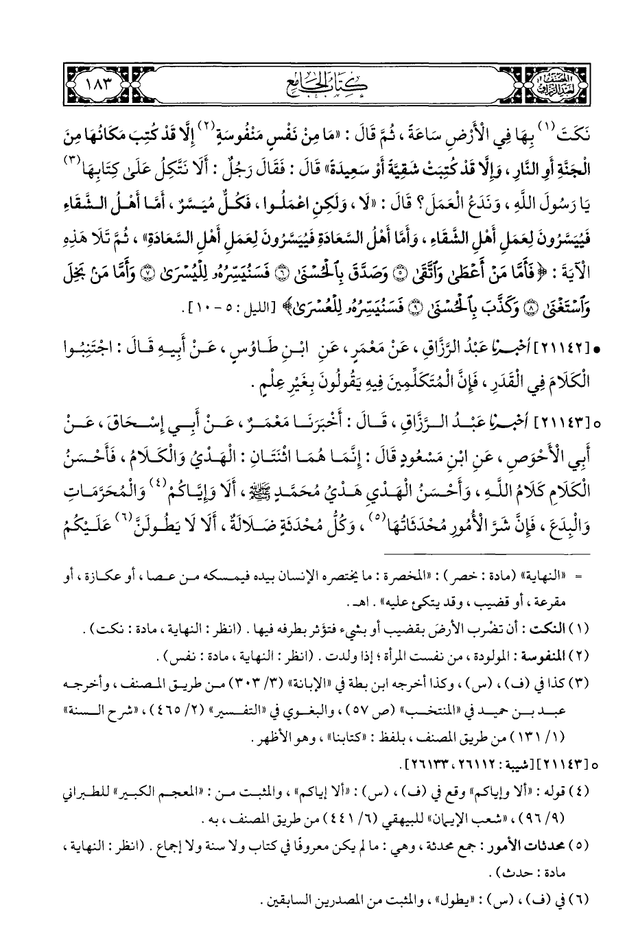° [٢١١٤٣] أَخْبَرَنَا عَبْدُ الرَّزَّاقِ، قَالَ: أَخْبَرَنَا مَعْمَرٌ، عَنْ أَبِي إِسْحَاقَ، عَنْ أَبِي الْأَحْوَصِ، عَنِ ابْنِ مَسْعُودٍ قَالَ: إِنَّمَا هُمَا اثْنَتَانِ: الْهَدْيُ وَالْكَلَامُ، فَأَحْسَنُ الْكَلَامِ كَلَامُ اللَّهِ، وَأَحْسَنُ الْهَدْيِ هَدْيُ مُحَمَّدٍ - صلى الله عليه وسلم -، أَلَا وإيَّاكُمْ (¬٤) وَالْمُحَرَّمَاتِ وَالْبِدَعَ، فَإِنَّ شَرَّ الْأُمُورِ مُحْدَثَاتُهَا (¬٥)، وَكُلُّ مُحْدَثَةٍ ضَلَالَة، أَلَا لَا يَطُولَنَّ (¬٦) عَلَيْكُمُ