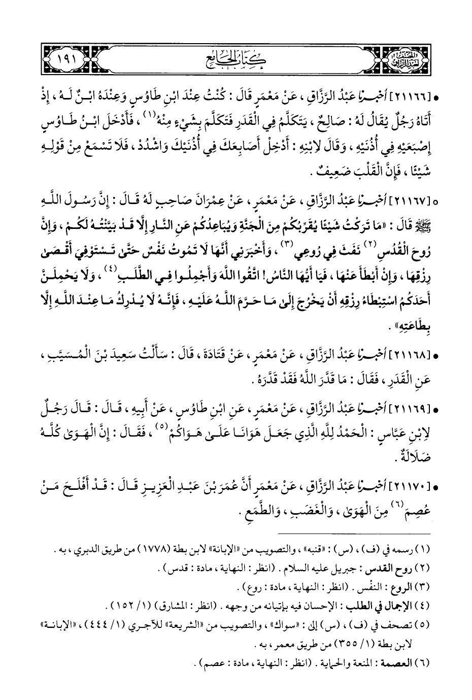 ° [٢١١٦٧] أَخْبَرَنَا عَبْدُ الرَّزَّاقِ، عَنْ مَعْمَرٍ، عَنْ عِمْرَانَ صَاحِبٍ لَهُ قَالَ: إِنَّ رَسُولَ اللهِ - صلى الله عليه وسلم - قَالَ: "مَا تَرَكْتُ شَيْئًا يُقَرِّبُكُمْ مِنَ الْجَنَّةِ وَيُبَاعِدُكمْ عَنِ النَّارِ إِلَّا قَدْ بَيَّنْتُهُ لكُمْ، وَإِنَّ رُوحَ الْقُدُسِ (¬٢) نَفَثَ فِي رُوعِي (¬٣)، وَأَخْبَرَنِي أَنَّهَا لَا تَمُوتُ نَفْسٌ حَتَّى تَسْتَوْفِيَ أَقْصَى رِزْقِهَا، وَإِنْ أَبْطَأَ عَنْهَا، فَيَا أَيهَا النَّاسُ! اتَّقُوا اللَّهَ وَأَجْمِلُوا فِي الطَّلَبِ (¬٤)، وَلَا يَحْمِلَنَّ أَحَدَكُمُ اسْتِبْطَاءُ رِزْقِهِ أَنْ يَخْرُجَ إِلَى مَا حَرَّمَ اللَّهُ عَلَيْهِ، فَإِنَّهُ لَا يُدْرِكُ مَا عِنْدَ اللَّهِ إِلَّا بِطَاعَتِهِ".