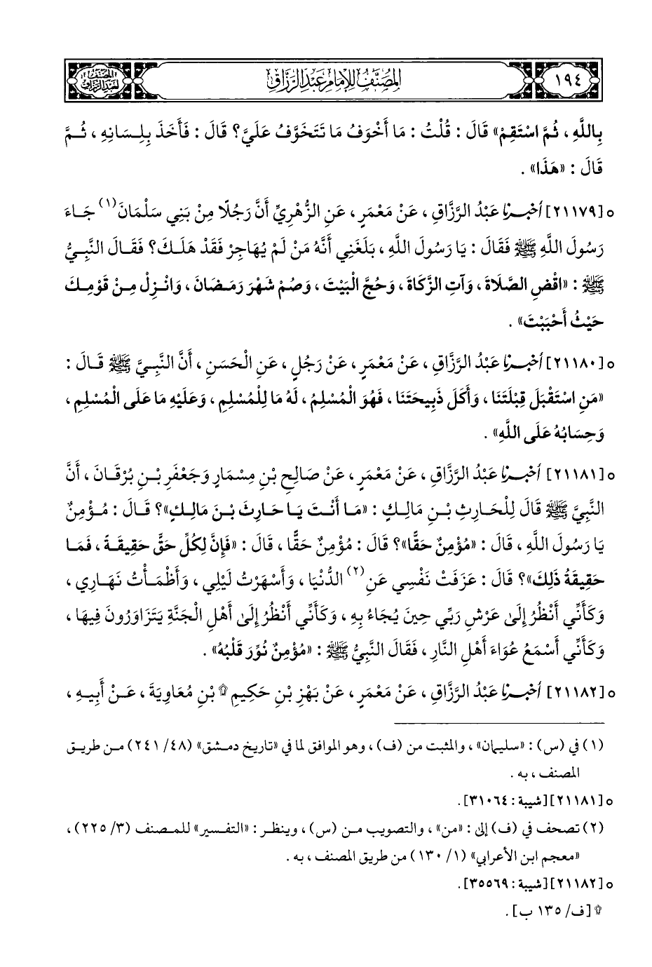 ° [٢١١٨١] أَخْبَرَنَا عَبْدُ الرَّزَّاقِ، عَنْ مَعْمَرٍ، عَنْ صَالِحِ بْنِ مِسْمَارٍ وَجَعْفَرِ بْنِ بُرْقَانَ، أَنَّ النَّبِيَّ - صلى الله عليه وسلم - قَالَ لِلْحَارِثِ بْنِ مَالِكٍ: "مَا أَنْتَ يَا حَارِثَ بْنَ مَالِكٍ"؟ قَالَ: مُؤْمِنٌ يَا رَسُولَ اللَّهِ، قَالَ: "مُؤْمِنٌ حَقًّا"؟ قَالَ: مُؤْمِنٌ حَقًّا، قَالَ: "فَإِنَّ لِكُلِّ حَقٍّ حَقِيقَةً، فَمَا حَقِيقَةُ ذَلِكَ"؟ قَالَ: عَزَفَتْ نَفْسِي عَنِ (¬٢) الدُّنْيَا، وَأَسْهَرْتُ لَيْلِي، وَأَظْمَأْتُ نَهَارِي، وَكَأَنِّي أَنْظُرُ إِلَى عَرْشِ رَبِّي حِينَ يُجَاءُ بِهِ، وَكَأَنِّي أَنْظُرُ إِلَى أَهْلِ الْجَنَّةِ يَتَزَاوَرُونَ فِيهَا، وَكَأَنِّي أَسْمَعُ عُوَاءَ أَهْلِ النَّارِ، فَقَالَ النَّبِيُّ - صلى الله عليه وسلم -: "مُؤْمِنٌ نُوِّرَ قَلْبُهُ".