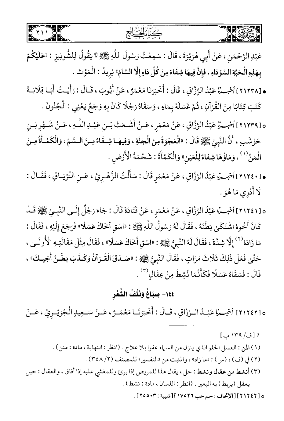 ° [٢١٢٤١] أَخْبَرَنَا عَبْدُ الرَّزَّاقِ، عَنْ مَعْمَرٍ، عَنْ قَتَادَةَ قَالَ: جَاءَ رَجُلٌ إِلَى النَّبِيِّ - صلى الله عليه وسلم - قَدْ كَانَ أَخُوهُ اشْتَكَى بَطْنَهُ، فَقَالَ لَهُ رَسُولُ اللهِ - صلى الله عليه وسلم -: "اسْقِ أَخَاكَ عَسَلًا" فَرَجَعَ إِلَيْهِ، فَقَالَ: مَا زَادَهُ (¬٢) إِلَّا شِدَّةً، فَقَالَ لَهُ النَّبِيُّ - صلى الله عليه وسلم -: "اسْقِ أَخَاكَ عَسَلًا"، فَقَالَ مِثْلَ مَقَالَتِهِ الْأُولَى، حَتَّى فَعَلَ ذَلِكَ ثَلَاثَ مَرَّاتٍ، فَقَالَ النَّبِيُّ - صلى الله عليه وسلم -: "صَدَقَ الْقُرْآنُ وَكَذَبَ بَطْنُ أَخِيكَ"، قَالَ: فَسَقَاهُ عَسَلًا فَكَأَنَّمَا نُشِطَ مِنْ عَقَالٍ (¬٣).