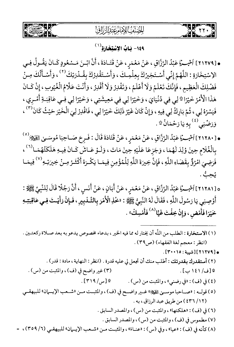 • [٢١٢٧٩] أخبرنا عَبْدُ الرَّزَّاقِ، عَنْ مَعْمَرٍ، عَنْ قَتَادَةَ، أَنَّ ابْنَ مَسْعُودٍ كَانَ يَقُولُ فِي الاِسْتِخَارَةِ: اللَّهُمَّ إِنِّي أَسْتَخِيرُكَ بِعِلْمِكَ، وَأَسْتَقْدِرُكَ بِقُدْرَتِكَ (¬٢)، وَأَسْأَلُكَ مِنْ فَضلِكَ الْعَظِيمِ، فَإِنَّكَ تَعْلَمُ وَلَا أَعْلَمُ، وَتَقْدِرُ وَلَا أَقْدِرُ، وَأَنْتَ عَلَّامُ الْغُيُوبِ، إِنْ كَانَ هَذَا الْأَمْرُ خَيْرًا * لِي فِي دُنْيَايَ، وَخَيْرًا لِي فِي مَعِيشَتِي، وَخَيْرًا لِي فِي عَاقِبَةِ أَمْرِي، فَيَسِّرْهُ لِي، ثُمَّ بَارِكْ لِي فِيهِ، وإِنْ كَانَ غَيْرُ ذَلِكَ خَيْرًا لِي، فَاقْدِرْ لِيَ الْخَيْرَ حَيْثُ كَانَ (¬٣)، وَرَضِّنِي (¬٤) بِهِ يَا رَحْمَانُ *.