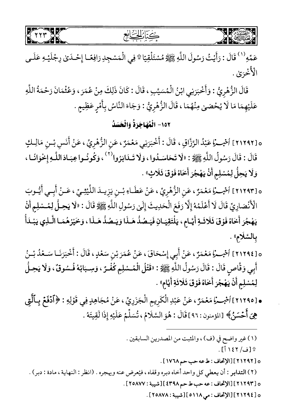 ° [٢١٢٩٣] أخبرنا مَعْمَرٌ، عَنِ الزُّهْرِيِّ، عَنْ عَطَاءِ بْنِ يَزِيدَ اللَّيْثِيِّ، عَنْ أَبِي أَيُّوبَ الْأَنْصَارِيِّ قَالَ لَا أَعْلَمُهُ إِلَّا رَفَعَ الْحَدِيثَ إِلَى رَسُولِ اللَّهِ - صلى الله عليه وسلم - قَالَ: "لَا يَحِلُّ لِمُسْلِمٍ أَنْ يَهْجُرَ أَخَاهُ فَوْقَ ثَلَاثَةِ أَيَّام، يَلْتَقِيَانِ فَيَصُدُّ هَذَا وَيَصُدُّ هَذَا، وَخَيْرُهُمَا الَّذِي يَبْدَأُ بِالسَّلَامِ".