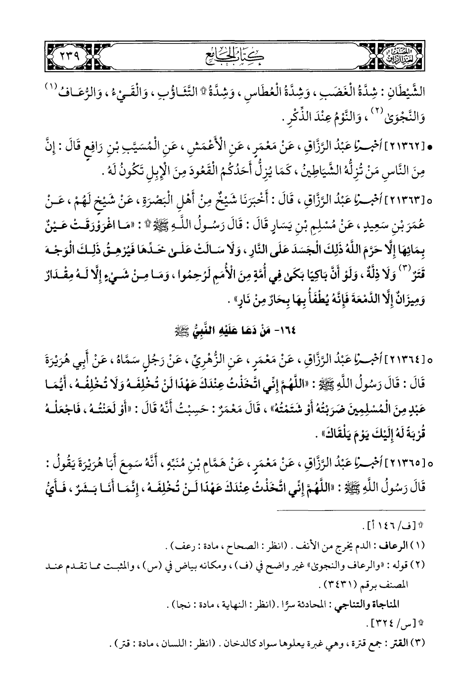 ° [٢١٣٦٤] أخبرنا عَبْدُ الرَّزَّاقِ، عَنْ مَعْمَرٍ، عَنِ الزُّهْرِيِّ، عَنْ رَجُلٍ سَمَّاهُ، عَنْ أَبِي هُرَيْرَةَ قَالَ: قَالَ رَسُولُ اللَّهِ - صلى الله عليه وسلم -: "اللَّهُمَّ إِني اتَّخَذتُ عِنْدَكَ عَهْدًا لَنْ تُخْلِفَهُ وَلَا تُخْلِفُهُ، أَيُّمَا عَبْدٍ مِنَ الْمُسْلِمِينَ ضَرَبْتُهُ أَوْ شَتَمْتُهُ"، قَالَ مَعْمَرٌ: حَسِبْتُ أَنَّهُ قَالَ: "أَوْ لَعَنْتُهُ، فَاجْعَلْهُ قُرْبَةَ لَهُ إِلَيْكَ يَوْمَ يَلْقَاكَ".