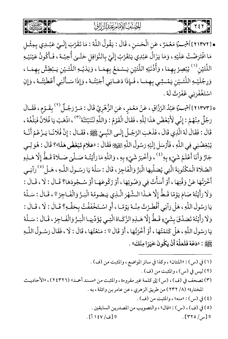 ° [٢١٣٧٠] أخبرنا عَبْدُ الرَّزَّاقِ، عَنْ مَعْمَر، عَنِ الزُّهْرِيِّ قَالَ: مَرَّ رَجُلٌ (¬٢) بِقَوْمٍ، فَقَالَ رَجُلٌ مِنْهُمْ: إِنِّي لأَبْغَضُ هَذَا لِلَّهِ، فَقَالَ الْقَومُ: وَاللَّهِ لَنُنَبِّئَنَّهُ (¬٣)، اذْهَبْ يَا فُلَانُ فَبَلِّغهُ، قَالَ: فَقَالَ لَهُ الَّذِي قَالَ، فَذَهَبَ الرَّجُلُ إِلَى النَّبِيِّ - صلى الله عليه وسلم -، فَقَالَ: إِنَّ فُلَانًا يَزْعُمُ أَنَّهُ يُبْغِضُنِي فِي اللهِ، فَأَرْسَلَ إلَيهِ رَسُولُ اللَّهِ - صلى الله عليه وسلم - فَقَالَ: "عَلَامَ تَبْغَضُ هَذَا"؟ قَالَ: هُوَ لِي جَارٌ وَأَنَا أَعْلَمُ شَيءٍ بِهِ (¬٤)، وَأَخْبَرُ شَيءٍ بِهِ، وَاللَّهِ مَا رَأَيْتُهُ صَلَّى صَلَاةً قَطُّ إِلَّا هَذِهِ الصَّلَاةَ الْمَكْتُوبَةَ الَّتِي يُصَلِّيهَا الْبَرُّ وَالْفَاجِرُ، قَالَ: سَلْهُ يَا رَسُولَ اللَّهِ، هَلْ (¬٥) رَآنِي أَخَّرتُهَا عَنْ وَقْتِهَا، أَوْ أَسَأْتُ فِي وَضُوئِهَا، أَوْ رُكُوعَهَا أَوْ سُجُودَهَا؟ قَالَ: لَا، قَالَ: وَلَا رَأَيْتُهُ صَامَ يَوْمًا قَطُّ إِلَّا هَذَا الشَّهْرَ الَّذِي يَصُومُهُ الْبَرُّ وَالْفَاجِرُ *، قَالَ: سَلْهُ يَا رَسُولَ اللَّهِ، هَلْ رَآنِي أَفْطَرْتُ مِنْهُ يَوْمًا، أَوِ اسْتَخْفَفْتُ بِحَقِّهِ؟ قَالَ: لَا، قَالَ: وَلَا رَأَيْتُهُ تَصدَّقَ بِشَيءٍ قَطُّ إِلَّا هَذِهِ الزَّكَاةَ الَّتِي يُؤَدِّيهَا الْبَرُّ وَالْفَاجِرُ، قَالَ: سَلْهُ يَا رَسُولَ اللَّهِ، هَلْ كَتَمْتُهَا، أَوْ أَخَّرْتُهَا، أَوْ قَالَ *: مَنَعْتُهَا، قَالَ: لَا، فَقَالَ رَسُولُ اللَّهِ - صلى الله عليه وسلم -: "دَعْهُ فَلَعَلَهُ أَنْ يَكُونَ خَيْرًا مِنْكَ".