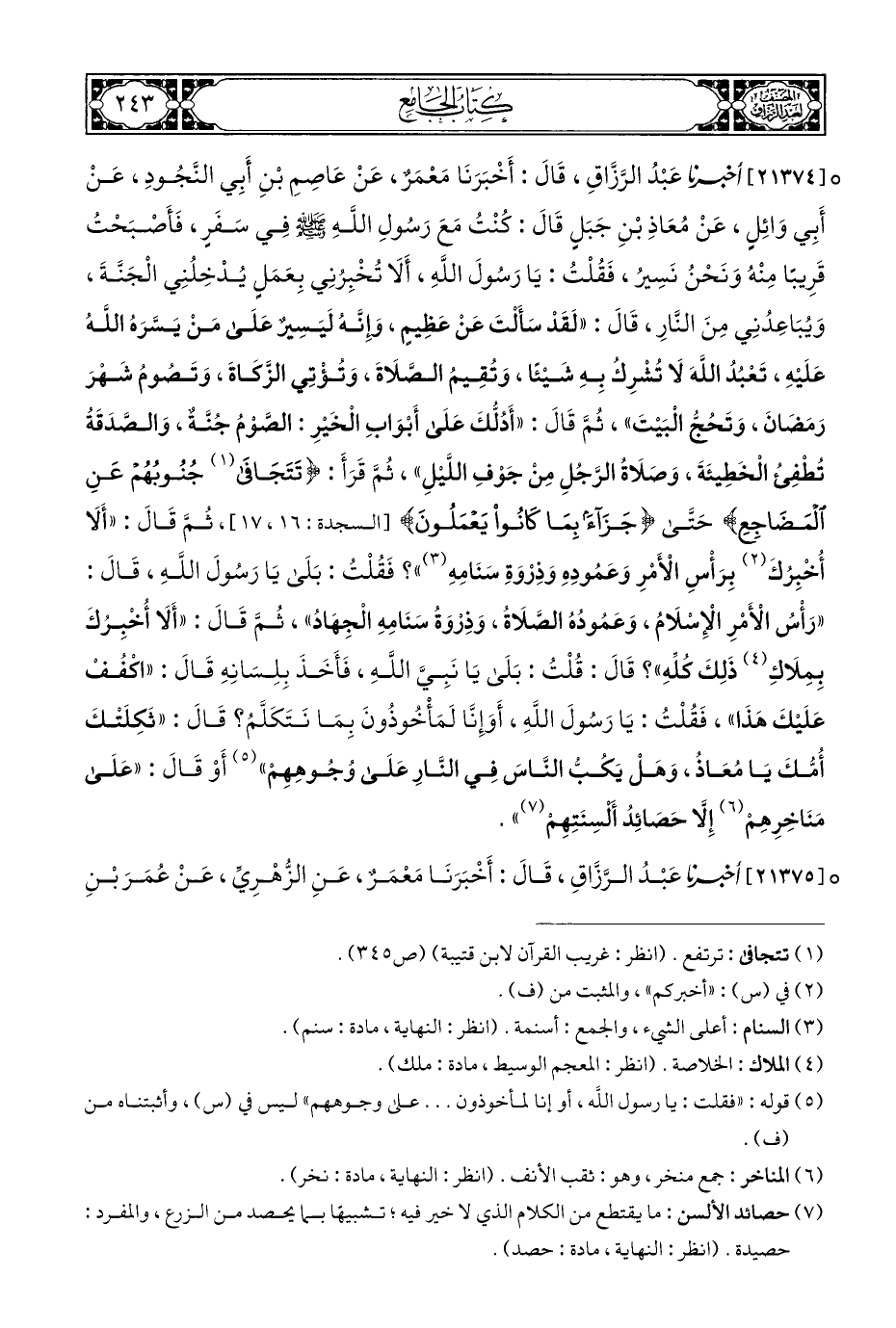 ° [٢١٣٧٠] أخبرنا عَبْدُ الرَّزَّاقِ، قَالَ: أَخْبَرَنَا مَعْمَرٌ، عَنْ عَاصِمِ بْنِ أَبِي النَّجُودِ، عَنْ أَبِي وَائِلٍ، عَنْ مُعَاذِ بْنِ جَبَلٍ قَالَ: كُنْتُ مَعَ رَسُولِ اللَّهِ - صلى الله عليه وسلم - فِي سَفَرٍ، فَأَصْبَحْتُ قَرِيبًا مِنْهُ وَنَحْنُ نَسِيرُ، فَقُلْتُ: يَا رَسُولَ اللَّهِ، أَلَا تُخْبِرُنِي بِعَمَلٍ يُدْخِلُنِي الْجَنَّةَ، وَيُبَاعِدُنِي مِنَ النَّارِ، قَالَ: "لَقَدْ سَأَلْتَ عَنْ عَظِيمٍ، وَإِنَّهُ لَيَسِير عَلَى مَنْ يَسَّرَهُ اللَّهُ عَلَيْهِ، تَعْبُدُ اللهَ لَا تُشْرِكُ بِهِ شَيْئًا، وَتُقِيمُ الصَّلَاةَ، وَتُؤْتِي الزَّكَاةَ، وَتَصُومُ شَهْرَ رَمَضَانَ، وَتَحُجُّ الْبَيْتَ"، ثُمَّ قَالَ: "أَدُلُّكَ عَلَى أَبْوَابِ الْخَيْرِ: الصَّوْمُ جُنَّةٌ، وَالصَّدَقَةُ تُطْفِئُ الْخَطِيئَةَ، وَصَلَاةُ الرَّجُلِ مِنْ جَوْفِ اللَّيلِ"، ثُمَّ قَرَأَ: {تَتَجَافَى (¬١) جُنُوبُهُمْ عَنِ الْمَضَاجِعِ} حَتَّى {جَزَاءً بِمَا كَانُوا يَعْمَلُونَ} [السجدة: ١٦، ١٧]، ثُمَّ قَالَ: "أَلَا أُخْبِرُكَ (¬٢) بِرَأْسِ الْأَمْرِ وَعَمُودِهِ وَذِرْوَةِ سَنَامِهِ (¬٣) "؟ فَقُلْتُ: بَلَى يَا رَسُولَ اللَّهِ، قَالَ: "رَأْسُ الْأَمْرِ الْإِسْلَامُ، وَعَمُودُهُ الصَّلَاةُ، وَذِرْوَةُ سَنَامِهِ الْجِهَادُ"، ثُمَّ قَالَ: "أَلَا أُخبِرُكَ بِمِلَاكِ (¬٤) ذَلِكَ كُلِّهِ "؟ قَالَ: قُلْتُ: بَلَى يَا نَبِيَّ اللَّهِ، فَأَخَذَ بِلِسَانِهِ قَالَ: "اكْفُفْ عَلَيكَ هَذَا"، فَقُلْتُ: يَا رَسُولَ اللَّهِ، أَوَإِنَّا لَمَأْخُوذُونَ بِمَا نَتَكَلَّمُ؟ قَالَ: "ثَكِلَتكَ أُمُّكَ يَا مُعَاذُ، وَهَلْ يَكُبُّ النَّاسَ فِي النَّارِ عَلَى وُجُوهِهِمْ" (¬٥) أَوْ قَالَ: "عَلَى مَنَاخِرهِمْ (¬٦) إِلَّا حَصَائِدُ أَلْسِنَتِهِمْ (¬٧) ".