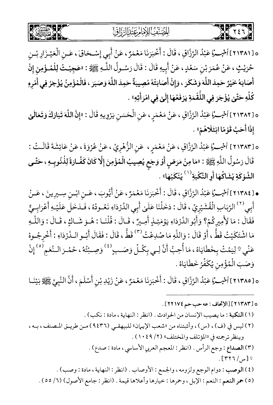 • [٢١٣٨٤] أخبرنا عَبْدُ الرَّزَّاقِ، قَالَ: أَخْبَرَنَا مَعْمَرٌ، عَنْ أَيُّوبَ، عَنِ ابْنِ سِيرِينَ، عَنْ أَبِي (¬٢) الرَّبَابِ الْقُشَيْرِيِّ، قَال: دَخَلْنَا عَلَى أَبِي الدَّرْدَاءِ نَعُودُهُ، فَدَخَلَ عَلَيْهِ أَعْرَابِيٌّ فَقَالَ: مَا لِأَمِيرِكُمْ؟ وَأَبُو الدَّرْدَاءِ يَوْمَئِذٍ أَمِيرٌ، قَالَ: قُلْنَا: هُوَ شَاكٍ، قَالَ: وَاللَّهِ مَا اشْتَكَيْتُ قَطُّ، أَوْ قَالَ: وَاللهِ مَا صُدِعْتُ (¬٣) قَطُّ، قَالَ: فَقَالَ أَبُو الدَّرْدَاءِ: أَخْرِجُوهُ عَنِّي * لِيَمُتْ بِخَطَايَاهُ، مَا أُحِبُّ أَنَّ لِي بِكُلِّ وَصبٍ (¬٤) وَصِبْتُهُ، حُمْرَ النَّعَمِ (¬٥) إِنَّ وَصبَ الْمُؤْمِنِ يُكَفِّرُ خَطَايَاهُ.